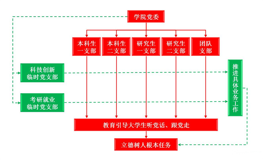 学院党委积极构建纵横结合的党建矩阵,纵向以党支部为抓手,进行党建工作的垂直业务指导,教育引导大学生坚决听党话跟党走;横向借鉴事业部制管理模式,依托考研就业、科技创新等具体工作成立临时党支部,形成党建工作与业务工作推进相结合的组织矩阵,以高质量党建引领高质量发展。