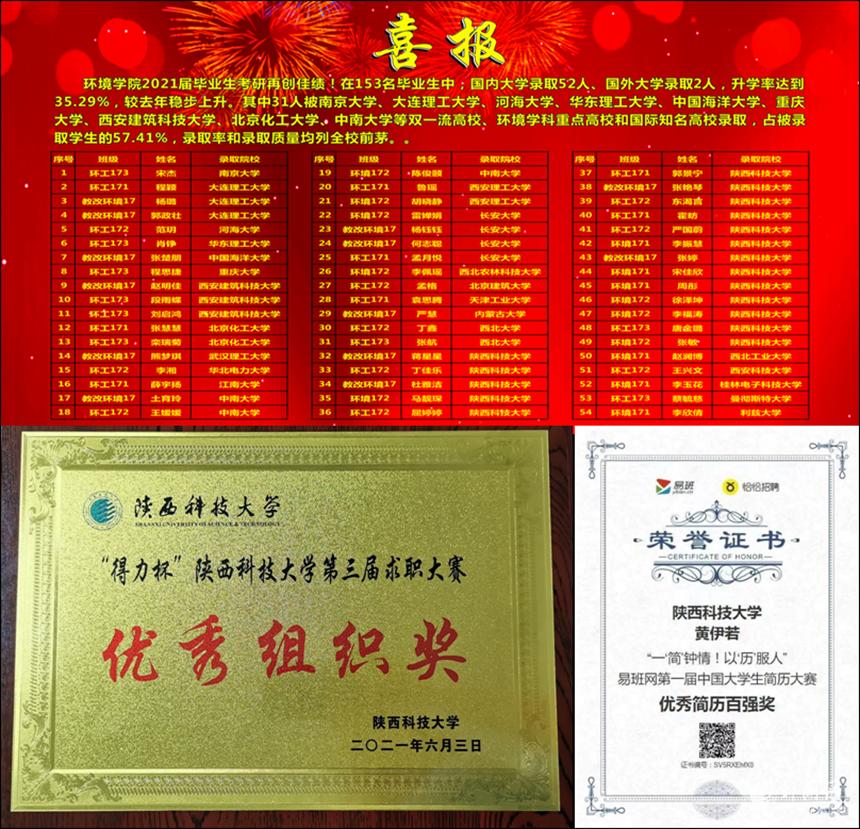 为破解“考研率、就业质量与学院发展定位不相称”难题,学院党委成立“考研就业临时党支部”,找准工作“小切口”,在为人民服务最前沿“解难题”,开展“考研党员一帮一”活动,通过经验介绍、课程辅导、目标院校选择辅导等对考研学生进行“一帮一”指导,2021届毕业生中考研报名率65.4%、考研上线率41.8%、考研录取率35.3%,均创学院历史新高,31名学生被南京大学、大连理工大学、中国海洋大学等“双一流”高校或教育部学科评估环境科学与工程学科“B”以上高校录取;开展“就业党员一帮一”活动,通过生涯规划指导、简历制作指导、面试技巧指导等对毕业生进行“一帮一”指导,在易班网第一届中国大学生简历大赛中,党员黄伊若荣获 “优秀简历百强奖”;在“得力杯”德赢官网Vwin第三届求职大赛中,党员孙于清荣获三等奖、党员黄伊若荣获人气奖、环境学院荣获优秀组织奖。30余名优秀毕业生前往国家能源集团、中海集团、中国石化、中国葛洲坝集团、中国电建集团等知名企业就业,毕业生就业质量明显提升。