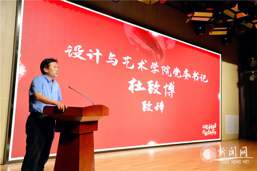 设艺学院党委书记杜致博代表学院进行致辞并宣布本次主题朗诵展演正式开始。他指出本次主题展演是学院党委在开展沉浸式党史教育过程中,指导院团委与教研室相互协作,将党史学习教育与学生自身兴趣特长相结合的生动实践。他借用习近平总书记的讲话寄语师生,要为中华民族的伟大复兴贡献自己的智慧和力量,不负时代,不负韶华,不负党和人民的殷切期望。