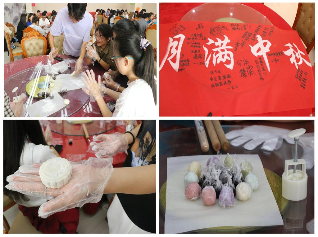 活动分为“花好月圆——DIY月饼“、“颂月”文学会、“笔端寄相思”三个环节。”“花好月圆——DIY中秋月饼“环节,同学们一起“捏皮”“做馅”“压模”,学生社团——食艺工坊的同学们为大家演示了月饼制作的步骤,对受大家欢迎的冰激凌月饼、广式月饼、苏式月饼、冰皮月饼的制作工艺做了专业的介绍,把专业知识融入学生活动。“颂月”文学会环节,中秋节以月之圆兆人之团圆,赏月的风俗源远流长,颂月的文学自成体系。仿照古代先贤,同学们在音乐声中朗诵唐代咏月诗句,慕古思乡、赏月玩月;在醇厚的茯茶清香中吟读宋代词曲,在源远流长的中华诗词中体验传统文化的魅力;在《呐喊》《彷徨》的片段朗读中,体会鲁迅先生对人生的深厚感悟和对社会的深度关切。笔端寄相思环节,同学们提笔写下对亲友、家乡的祝福。月圆中秋夜,千里共婵娟。