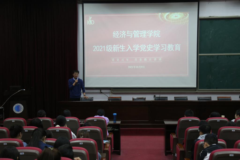 为引导2021级新生厚植爱党爱国情怀,从百年党史中汲取奋进动力,做有志气、有骨气、有底气的新时代青年,经济与管理学院积极将党史学习教育有机融入2021级新生入学教育全过程。10月9日上午,经管学院邀请德赢官网Vwin“红色基因·薪火传承”党史学习教育研究生宣讲团为学院2021级新生作党史学习教育专题宣讲报告。