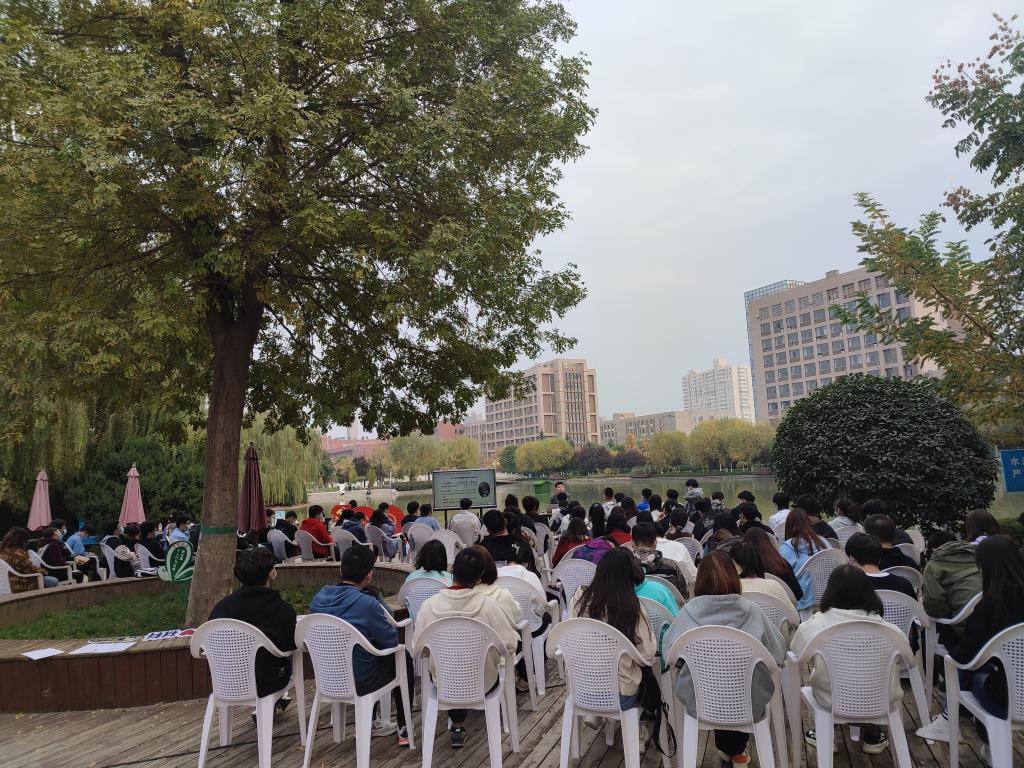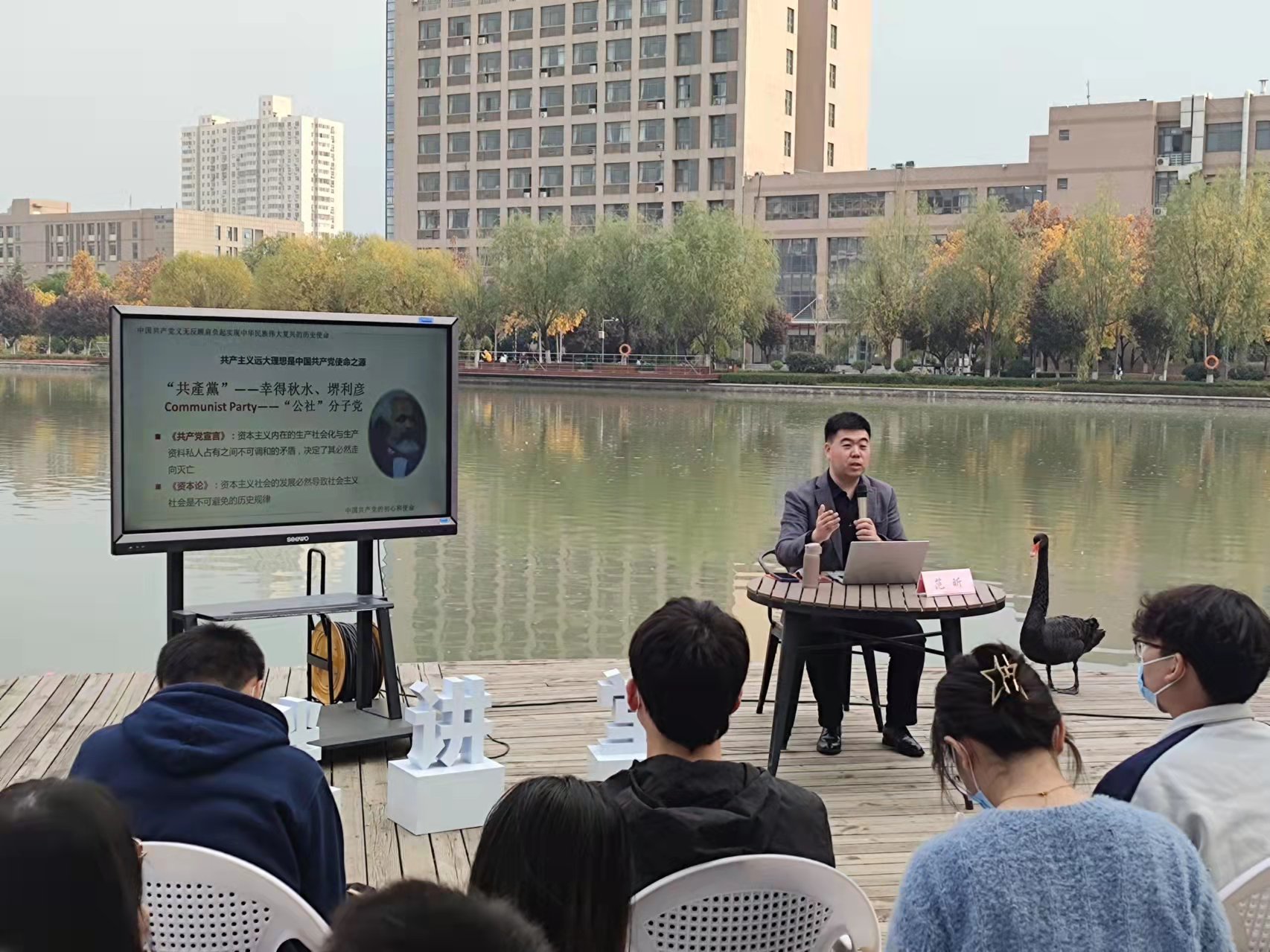秋日的科大湖畔,层林尽染,碧波荡漾,材料学院“湖畔讲堂”也在10月31日的下午如约而至。马克思主义学院“思想道德与法治”教研部主任、陕西省思政课大练兵教学骨干范昕受邀做客“湖畔讲堂”,在风景如画的湖边与材料学院90余名师生交流 “初心”与“核心”话题,引导同学们追求真理、坚定信仰,砥砺前行。