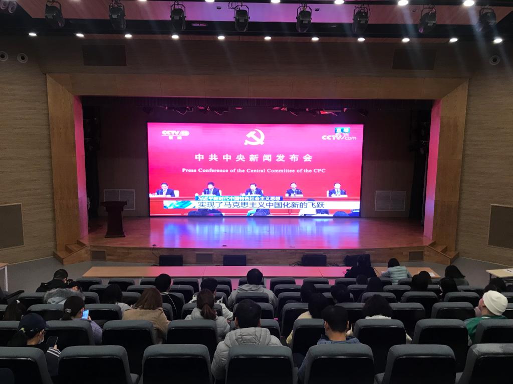 设艺学院党委此前分别于11月12日组织全体教工及学生代表集中收看了中共中央举行的介绍党的十九届六中全会精神的新闻发布会,11月17日组织全体教工收看了央视新闻联播中习近平关于《中共中央关于党的百年奋斗重大成就和历史经验的决议》的说明和《中共中央关于党的百年奋斗重大成就和历史经验的决议》公布等几则新闻,在全院掀起了学习宣传十九届六中全会精神的高潮。