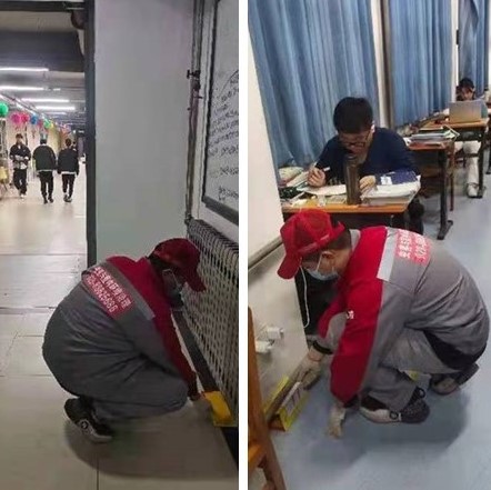 12月2日,后勤集团副总经理刘强亲自带队,对餐厅、水源、学生公寓、教室、公共区域等卫生予以集中督促整治,并制定出出血热防治应急预案。自12月3日开始全面开展校园卫生环境整治及消杀工作,邀请专业人员对图书馆、逸夫楼、公寓楼、沁园餐厅、馨园餐厅等处进行鼠密度检测,根据检测结果安排专人投放毒饵盒200余个,粘鼠板100余个,对全校下水口进行加固加密,尤其加大食堂、公寓门缝、下水口等处粘鼠板的投放,做好各项防护措施。
