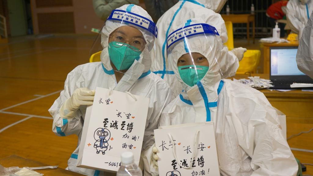 在紧张有序的核酸检测结束后,党员代表们带着小礼品现场慰问医务工作人员。党员代表们一边送上礼物,一边问候“正是因为你们不怕辛苦,坚守岗位,才为我们筑起了坚实的疫情防控堡垒。”