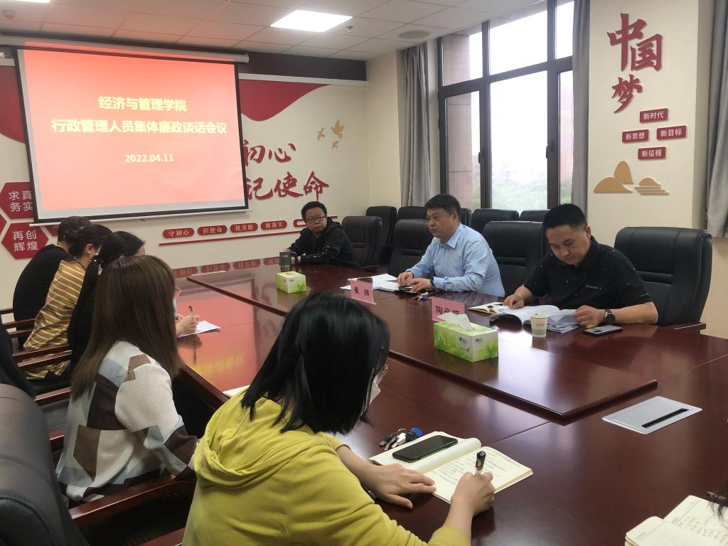 4月11日下午,经济与管理学院在人文楼A415召开行政管理人员廉政谈话会议,学院党委书记崔楠、纪委书记陶兴旺、办公室主任、本科教学秘书、研究生秘书、国际交流秘书、科研秘书及全体辅导员参加会议。