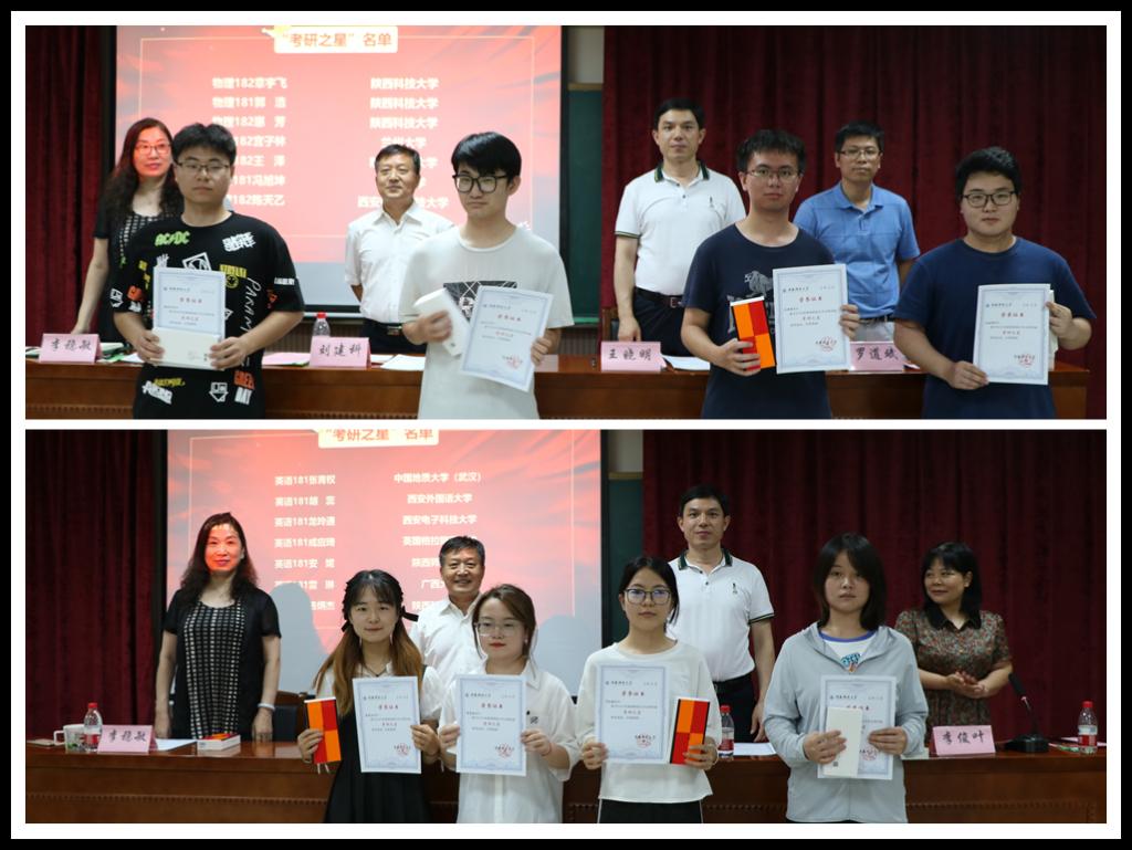 同时,会议还对学院2022届毕业生中考研成绩优异的33位“考研之星”和就业表现积极的16位“就业之星”进行了表彰,物理专业优秀毕业生闫沛栋、冯旭坤、侯伟伟和英语专业优秀毕业生李梦娇分享了保研、考研、就业相关经验和准备方法,鼓励2023届学弟学妹们摆正心态,积极行动,不畏艰难,努力坚持。