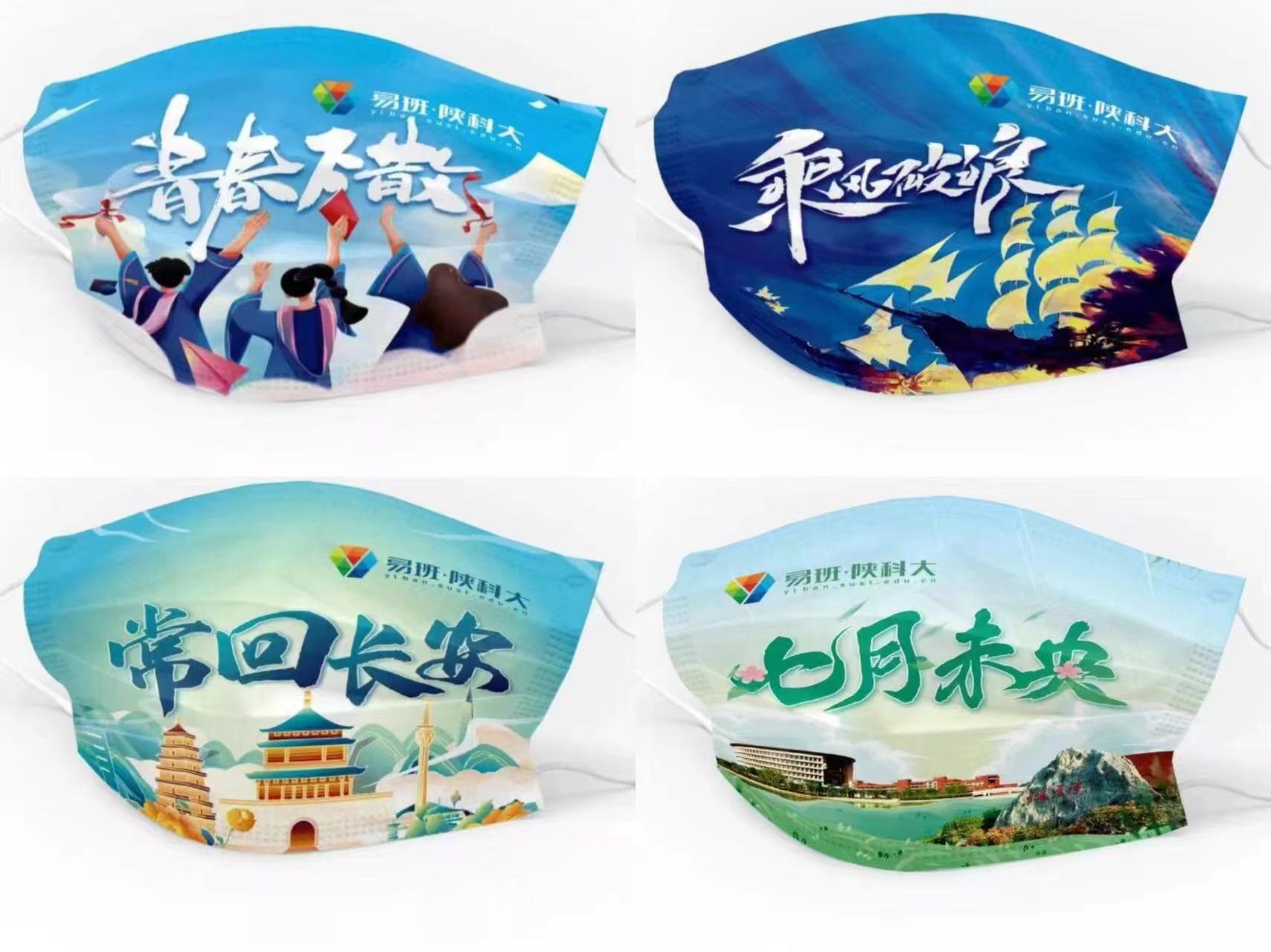 “守住健康、承载回忆、传递力量,以⼝罩之名,纪念那些共同抗疫的无悔青春。”易班发展中心为全体毕业生定制的“青春之歌”系列口罩以及“前程似锦”系列手袋深受毕业生喜爱。定制口罩包括“纪念青春”“鲲鹏展翅”“回首相聚”等六种款式,色彩绚丽,质感极佳。定制手袋包括“常回长安”“丝路前行”两种款式,通过国风元素描绘千年古都与美丽科大的经典建筑,同时融入铁路、高层建筑等现代元素,古今呼应,和谐交融,寓意2022届毕业生身处中国特色社会主义新时代,更需鉴古知今,与祖国共奋进,与时代共成长。