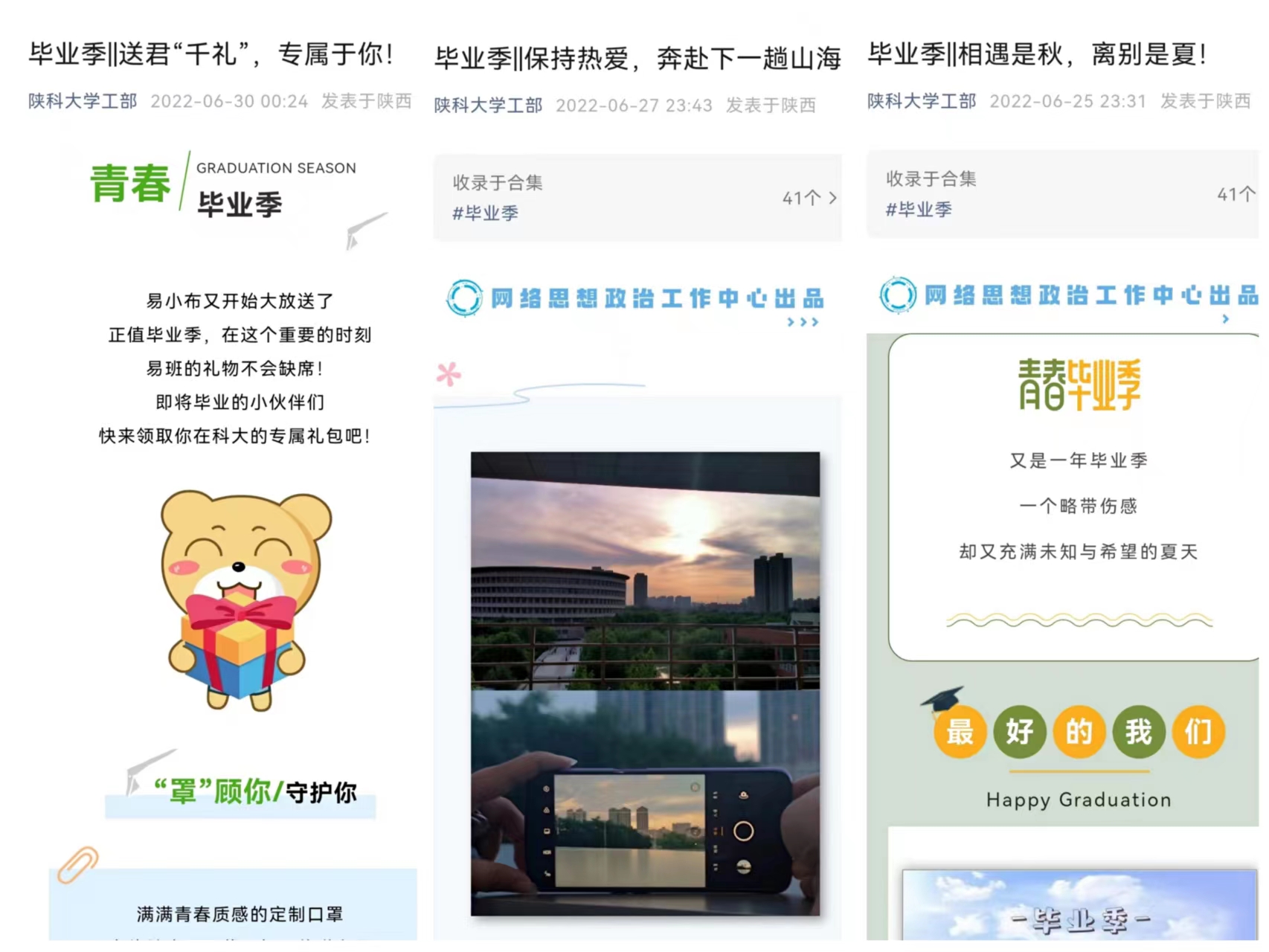 “乘风破浪奔赴各地建功业,历尽千帆不忘初心仍少年”“意气风发披荆斩棘求真知,积以跬步纵横天下绘宏图”,6月24日,陕科大校园里挂上了数十条彩色横幅,公寓楼前、餐厅门口,每位毕业生目之所及都是来自学校的深深祝福。同时,在网络上,依托于微信订阅号、视频号等媒体矩阵推出的“毕业季”系列专栏也吸引了众多师生的目光。11篇系列作品,万余次点击量,《相遇是秋,离别是夏》《送君“千礼”,专属于你》《破茧窥光,跃入人海》《保持热爱,奔赴下一趟山海》……引导毕业生在惜别友情、感恩母校的同时,以更加积极开放的心态面对未来。