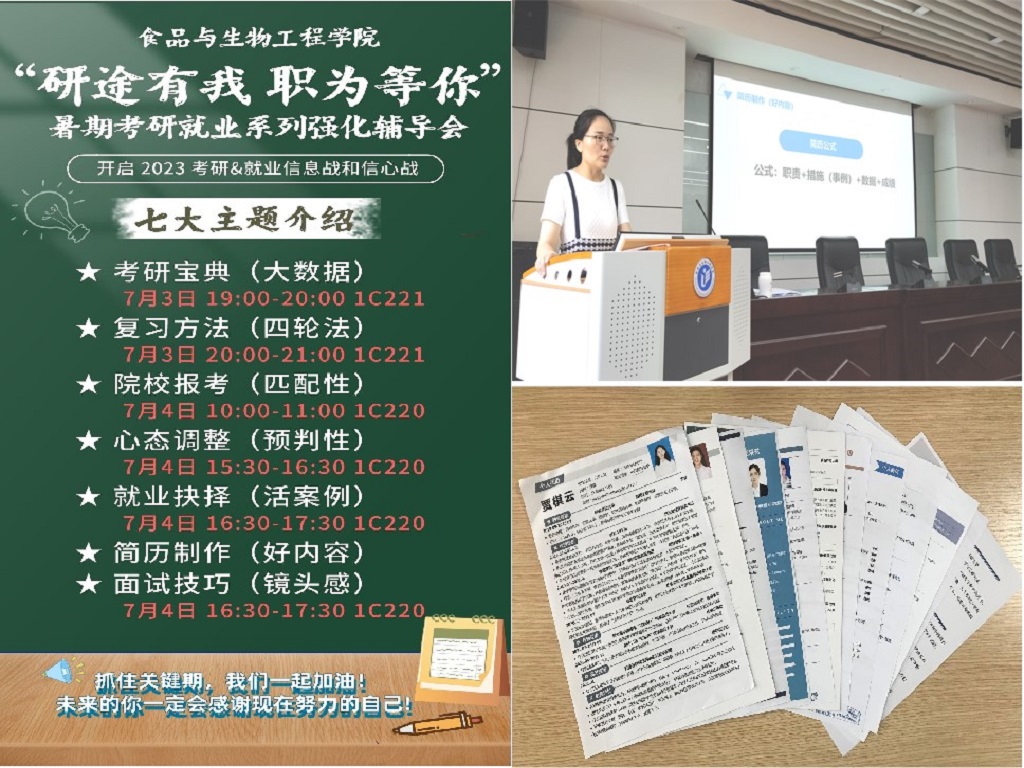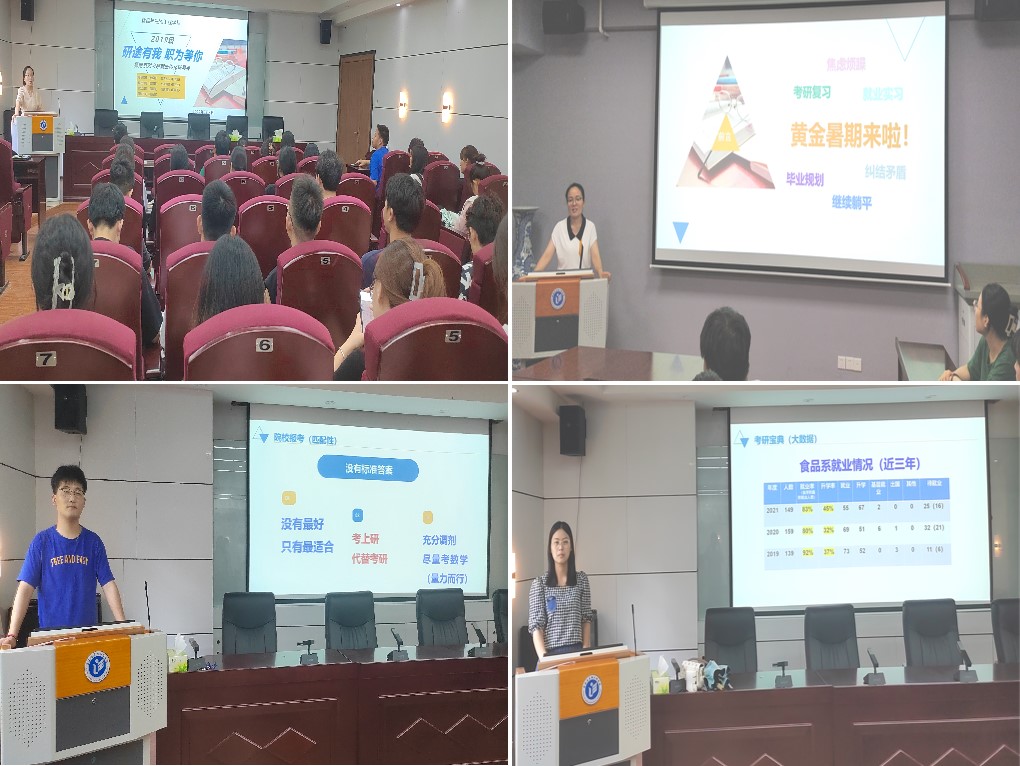 为深入贯彻落实学校“三三三制”人才培养输出目标,做好2023届学生的毕业规划和就业指导工作,4月至7月初,食品学院提早谋划、夯实措施、分解任务、阶段推进,线上线下多层次开展“研途有我、职为等你”系列考研就业指导工作,帮助学生合理规划、澄清目标、掌握方法,提升考研就业能力,切实打好2023届毕业生考研就业工作哨前战。