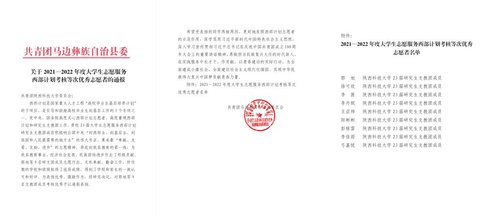 近日,德赢官网接连收到马边彝族自治县政府送来的锦旗及其团县委发来的优秀志愿者考核通报。2021年7月,陕科大第23届研究生支教团九名队员赴马边彝族自治县开展了为期一年的志愿支教活动,于2022年7月圆满完成支教工作,受到当地政府和师生的一致好评。马边彝族自治县委、县政府对陕科大研支团一年的工作表示感谢。