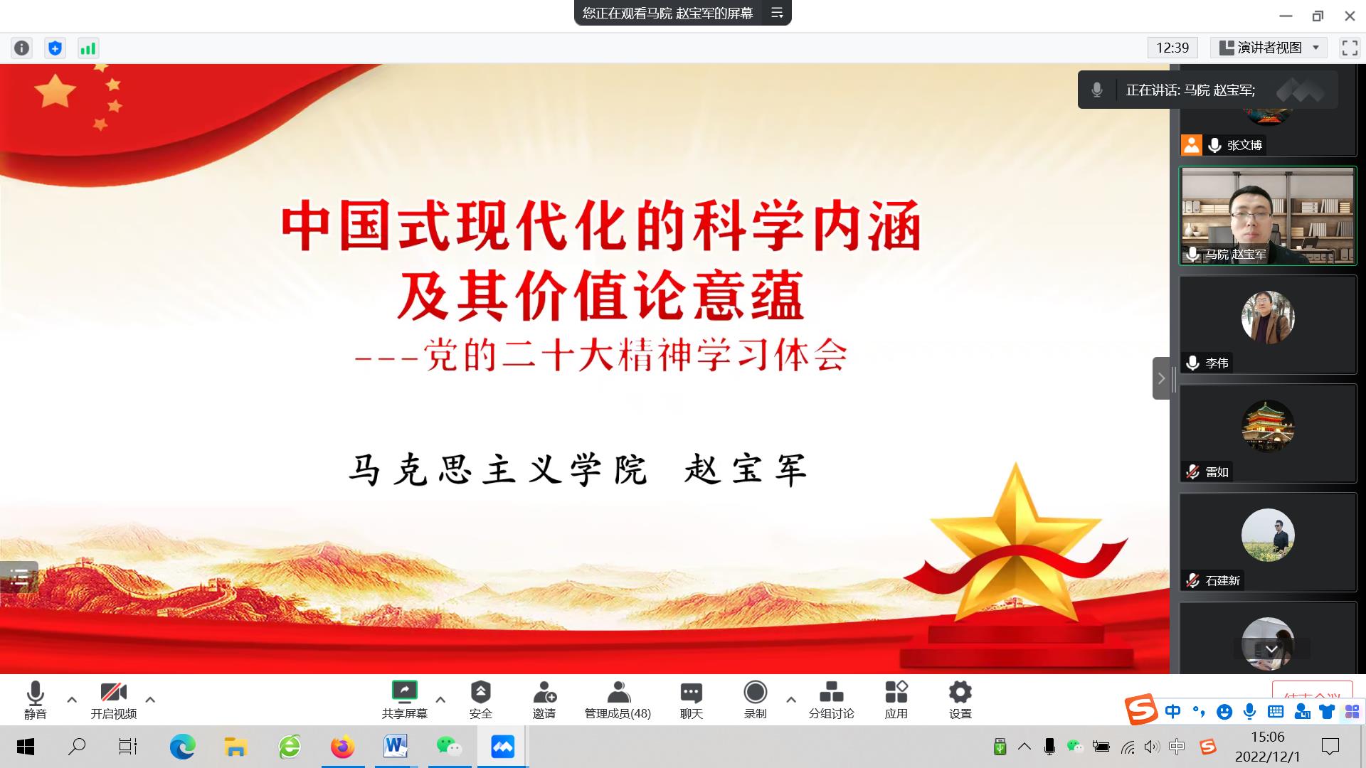 活动特邀德赢官网马克思主义学院副教授赵宝军以“中国式现代化的科学内涵及其价值论意蕴”为主题,对党的二十大报告进行深度解读。赵宝军副教授长期从事马克思主义技术社会形态思想、培育和践行社会主义核心价值观、价值哲学、人工智能哲学等领域的教学与研究。此次报告从中国式现代化的提出与发展历程、科学内涵、价值论意蕴等三个方面详细阐述了党的二十大报告中中国式现代化的丰富内涵,并对中国式现代化的五个特征、九方面要求进行了解读。