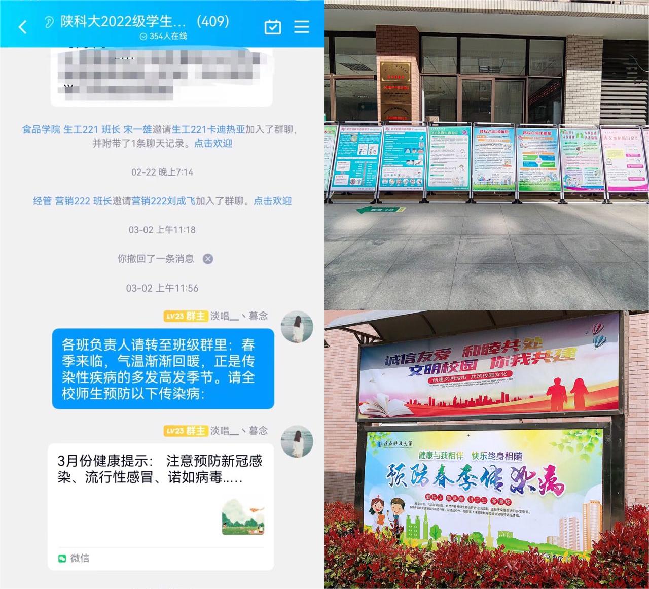 同时,校医院利用线上线下各种宣传渠道进行春季常见传染病如流感、诺如病毒、出血热等疾病的相关宣传教育活动,切实提高学生的自我防护意识和能力。线下张贴、设立各种疾病防治宣传标语、宣传牌,线上采取由点及面、辐射传播的方式,通过4个学生健康群对全校所有班级1400余名学生代表进行传染病防控知识宣传教育,再由学生代表将相关知识点转发到班级群,传达给班级每一名同学,以达到快速高效、详细准确的宣传效果。