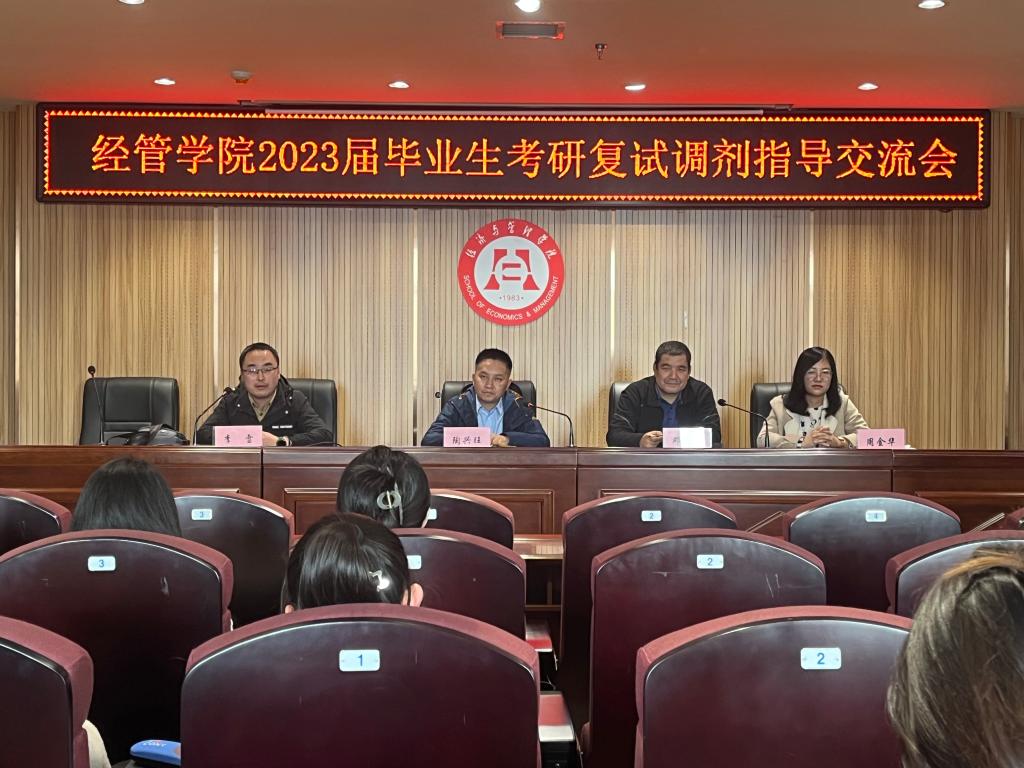 为进一步做好2023届考研学生复试调剂工作,指导学生更好的掌握考研复试技巧,提前做好复试及调剂相关准备。3月20日,经济与管理学院在人文楼A712会议室举办2023届毕业生考研复试调剂指导交流会。学院学生工作负责人陶兴旺、教师代表、毕业班辅导员及54名拟参加复试调剂的考研学生参加交流会。
