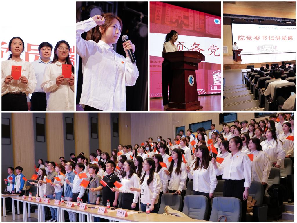 入党宣誓仪式在共同奏唱《国际歌》后正式开始。安玲宣读了学院党委关于同意接收预备党员的批复文件。学院党委委员及各党支部书记为预备党员佩戴党徽并发放《中国共产党章程》。随后全体党员面向党旗,庄严宣誓。新发展党员周鑫代表全体预备党员表态发言。