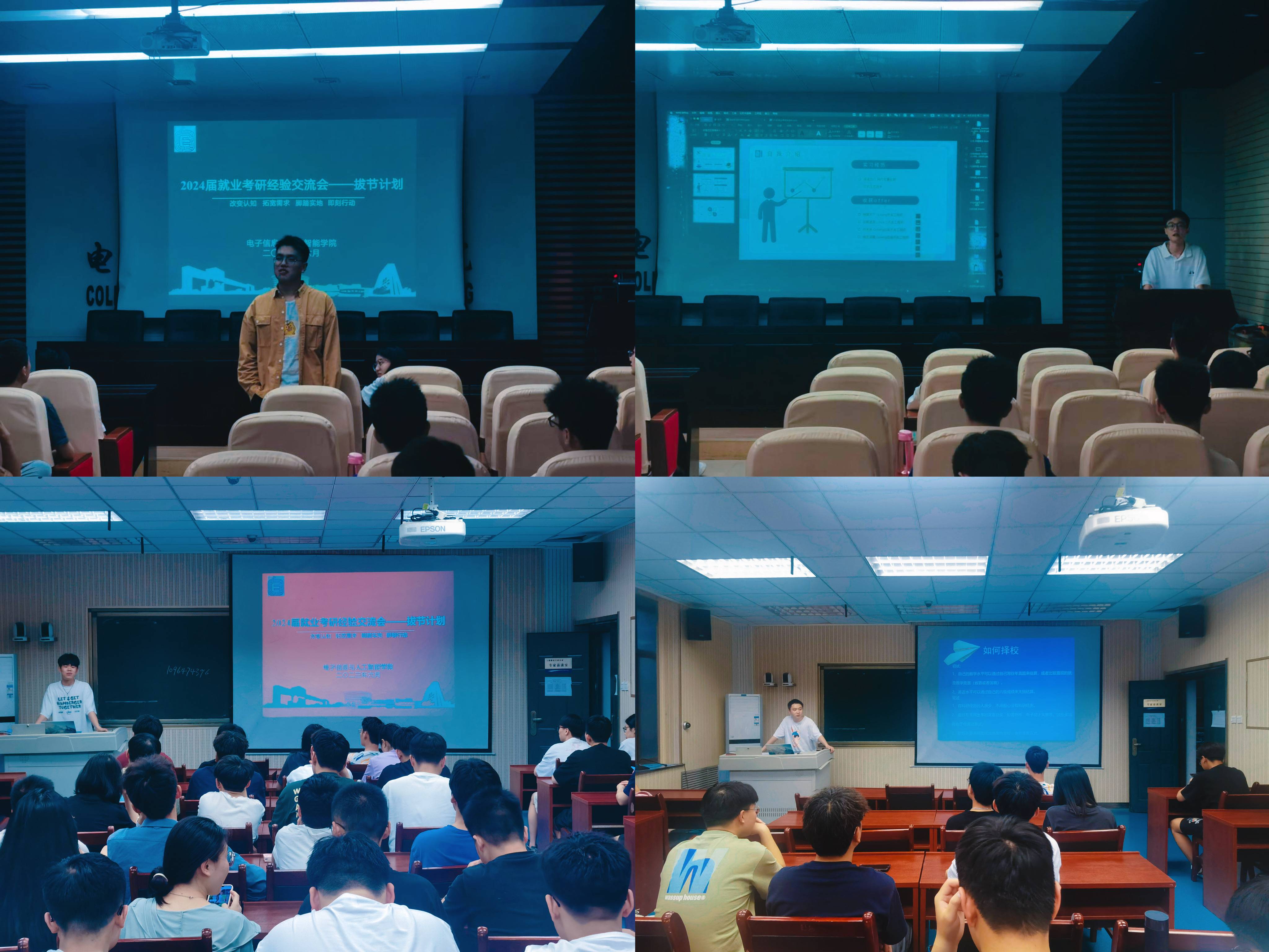 为增加校友情,同窗情,电智学院在梳理2023届学生成长奋进的历程后,遴选考研423分成功上岸西安交通大学的学生盛若帆,考研346分报考一志愿未酬、几经调剂辗转上岸的学生傅嘉辉,四年学习成绩优异、坚定报考母校的学生张豪等3名考研学子;遴选一直在滴滴实习、临毕业前行业面临危机、整个项目组裁员后迅速调整成功就业格灵深瞳的学生韩松洋,考研失利后积极寻求就业指导帮扶,在春招中签约北斗研究院的学生石继龙等2名就业学子组成考研就业经验交流宣讲团,从个人成长经历、备考经验,就业心得等方面,从过程中经历的彷徨、孤独、犹豫、怀疑等感受,面向全院学生以宣讲、座谈等形式,情真意切向学弟学妹传递了殷切嘱托,坚定了考研学生刻苦复习,一战成硕的信念,坚定了求职知己知彼,主动出击的信心。