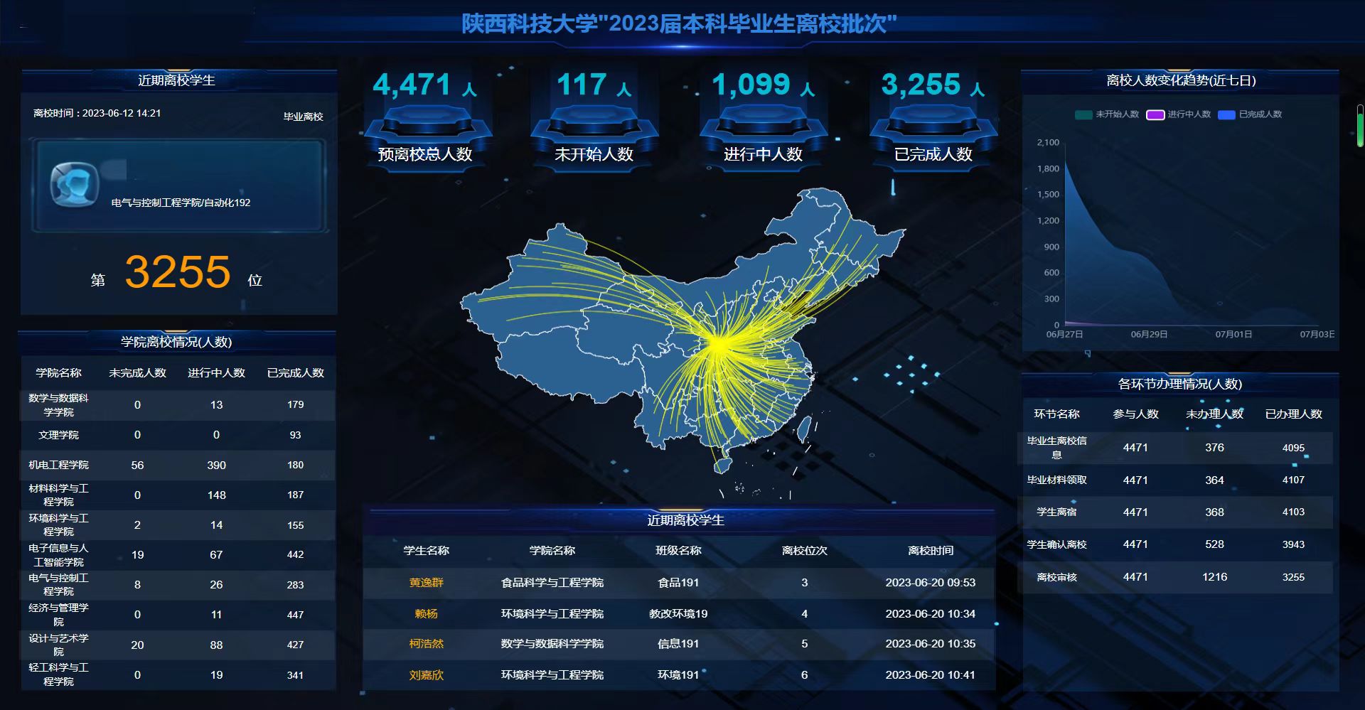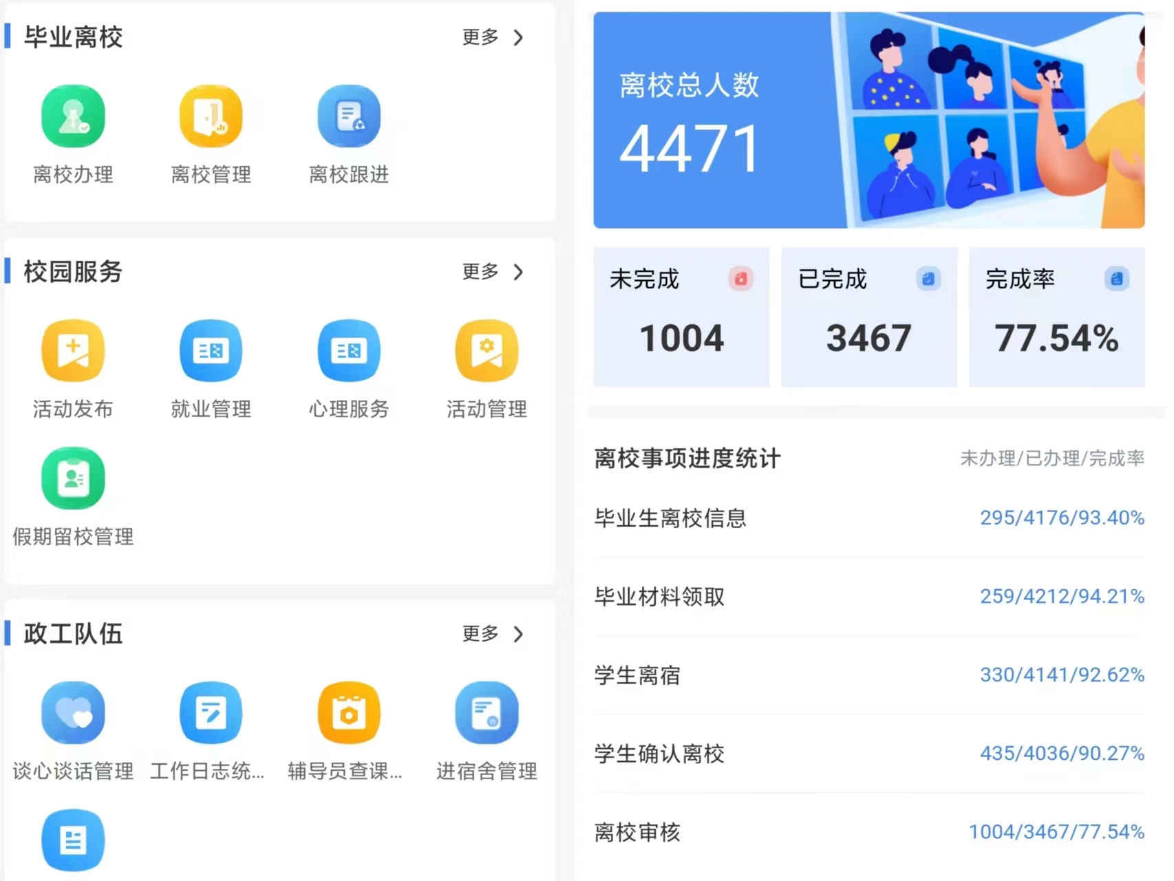 网络思政中心会同学工部,统筹专业力量,打造上线毕业生数字离校应用系统,实现了基于易班的学生日常管理系统的再升级。该应用包含离校信息统计、毕业材料领取、离宿办理、确认离校、教师审核等5个环节,学生根据个人安排自主进行相应业务办理,实现毕业筹备“一键开启”。离校全程环环相扣,实时数据动态更新,管理人员一机在手,即可总揽全局,极大程度提升了工作的便捷化和数据化。