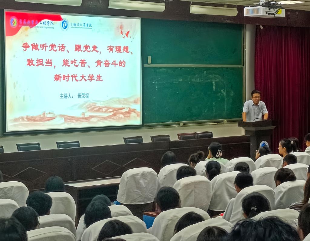 食品科学与工程学院(生物与医药学院)2023级新生入学教育系列活动于9月11日晚在三号教学楼101教室拉开帷幕。学院党委书记訾荣禄以“争做听党话、跟党走,有理想、敢担当,能吃苦、肯奋斗的新时代大学生”为题讲授学院入学教育第一课。活动由学院党委副书记孙敏主持,全体本科新生班主任、辅导员、班主任助理和305名本科新生参加。
