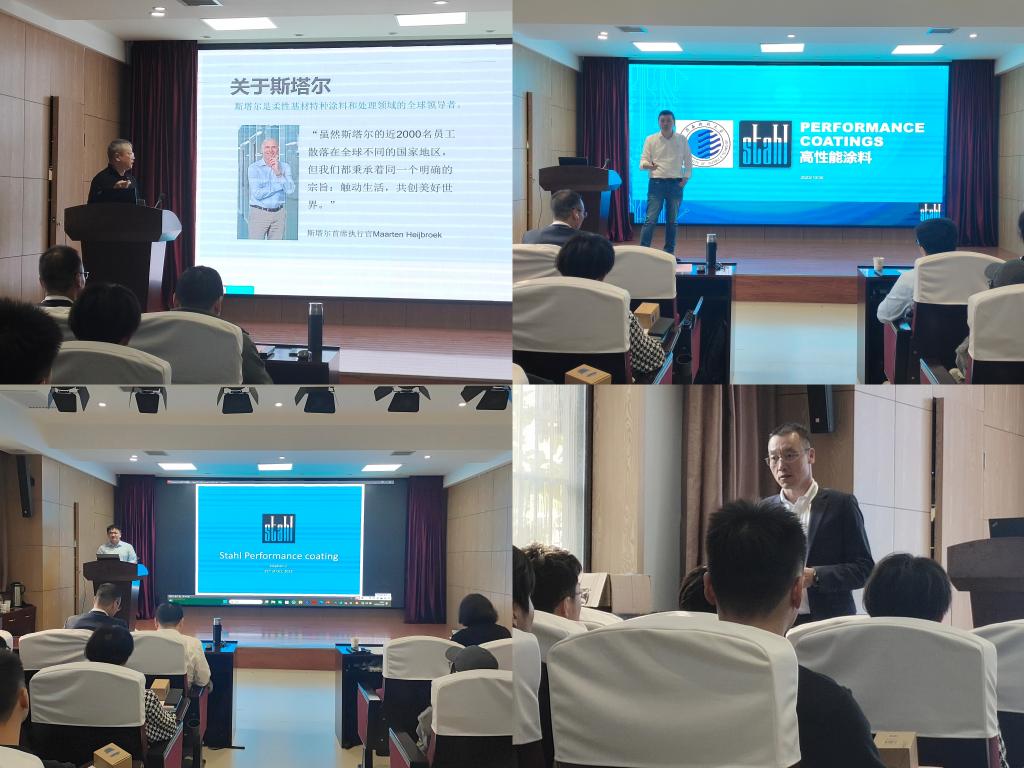 本次培训分为技术交流、技术培训和成果展示三个部分。开班仪式上,夏敏就企业历程及发展前景进行了介绍;郭祥就高性能涂料部门环保性产品的开发及循环利用,特别是生物基材料方面做了报告;李建辉对水性聚氨酯和无溶剂聚氨酯在合成革生产中的应用开展详细讲解;最后,张景伟对本次技术交流进行总结,并结合自身发展就职业生涯与个人规划和学生进行了充分交流。