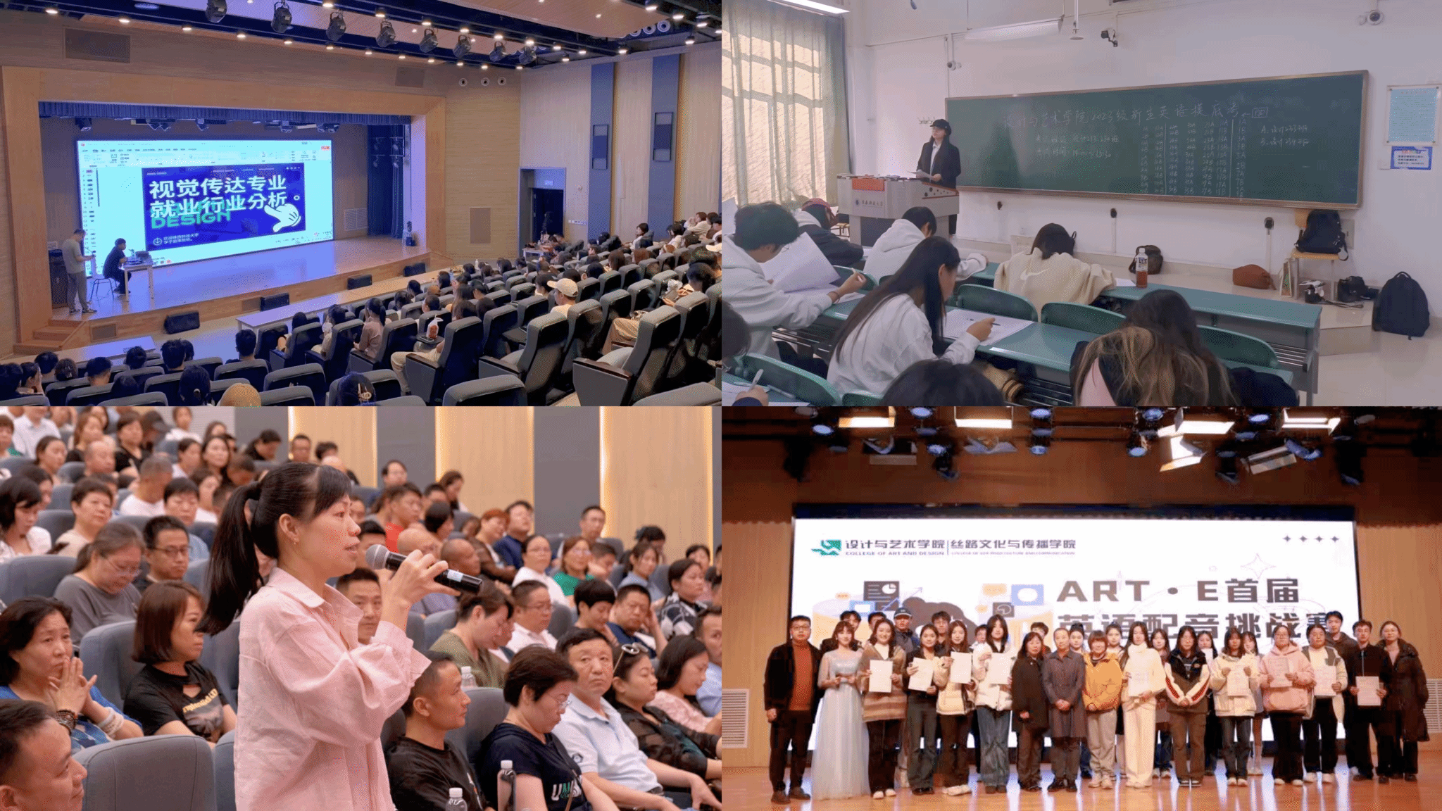 学业规划“零距离”,用服务“培优”为新生吹响“冲锋号”。结合专业特点,学院精心组织专业复测,先后开展“院长第一课”“名师第一课”强化新生专业认同,解答学生个人发展规划困惑。开学伊始,学院高度重视家校联动协同育人,召开新生家长见面会,针对本科生教学计划、人才培养计划、考研与就业形势等内容,组织领导干部、专业课教师、辅导员等向家长与学生进行宣讲。同时,通过专业解读讲座、作品集规划讲座、职业生涯规划讲座、奖助学金政策解读、优秀学子事迹推送等,引导学生尽快明晰学业规划。其中,围绕学校本科生“三三三”人才培养输出目标,针对艺术生英语单科基础薄弱问题,拟定《设计与艺术学院英语单科提升计划》,开展ART·E 四级英语模拟考试、讲师团、单词打卡以及配音挑战赛等4场系列活动营造英语学习氛围,培养学生优良学风,引导学生提早做好职业发展规划。