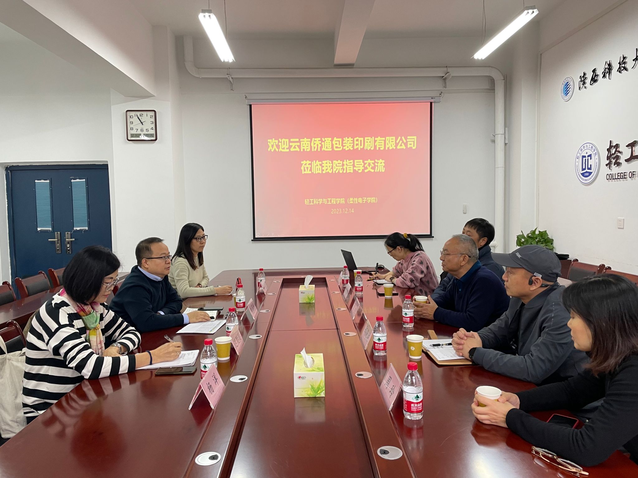 12月14日上午,云南侨通包装印刷有限公司副总经理、技术中心主任文杰,副主任郑晓波,研发部部长桑波,办公室主任周玲,研发部研究员夏玮玮等一行到轻工科学与工程学院(柔性电子学院)进行交流。轻工学院副院长刘国栋、印刷工程系主任迟聪聪、印刷系教师代表参加座谈。会议由刘国栋主持。