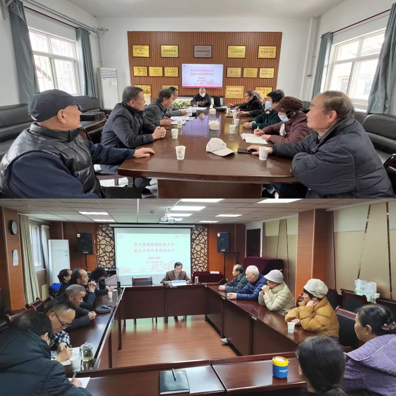 为深入学习贯彻落实学校第三次党代会精神,把全校离退休教职工的思想统一到第三次党代会精神上来,自1月14日以来,离退处党委先后召开党委扩大会议、党建工作会议、中心组专题学习会、党支部组织生活会,精心组织开展了学校第三次党代会精神系列学习活动;并在离退处公众号及时推送《一图读懂!德赢官网Vwin第三次党代会报告》《一图速览!德赢官网Vwin第三次党代会纪委工作报告》,以便老同志跟进学习。离退处党委以学深悟透第三次党会精神为目标,从充分认识学习贯彻落实学校第三次党代会精神的重大意义、深刻领会学校第三次党代会的精神实质与把党代会精神落到实处三个方面引领全体离退休党员和教职工学习。