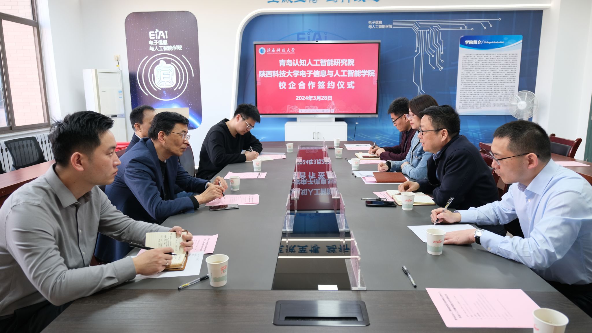 为深化院校合作,切实推进产教融合,3月28日上午,青岛认知人工智能研究院理事长马皑、院长肖维斌、总工程师宋业臻、研发总监黄杰一行4人来校交流。电子信息与人工智能学院党委书记吕文华、院长马令坤、院长助理任喜伟、电信系教授章为川及相关教师参加了座谈,会议由吕文华主持。
