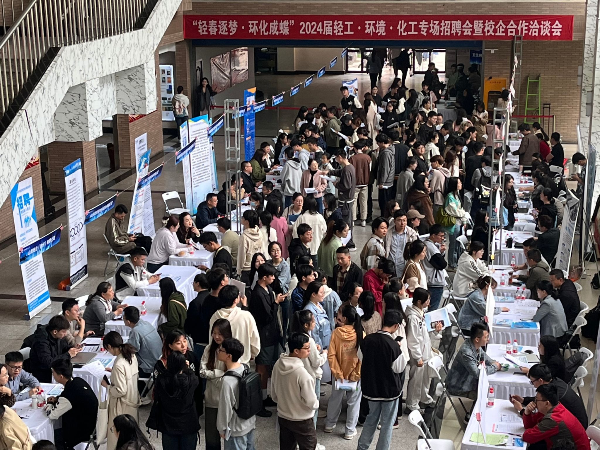 为拓宽就业渠道,持续精准推进2024届毕业生高质量就业,轻工科学与工程学院(柔性电子学院)、环境科学与工程学院(碳中和科学与技术学院)、化学与化工学院于4月2日在实验楼1B一楼大厅联合举办“轻春逐梦·环化成蝶”2024届轻工•环境•化工专场招聘暨校企合作洽谈会。