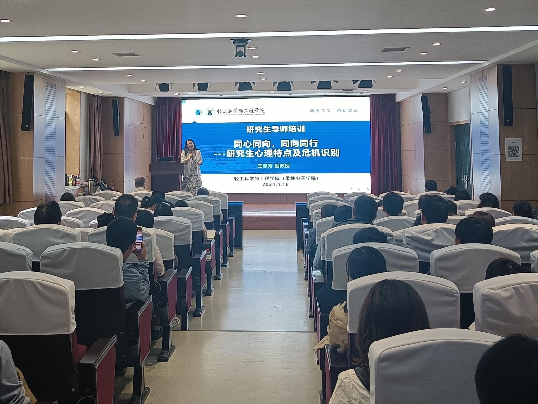 为提升学院研究生导师识别学生心理状况、关注学生身心健康方面的工作能力,加强研究生导师心理健康教育水平,建设更加和谐的导学关系,4月16日下午,轻工科学与工程学院(柔性电子学院)于学院学术报告厅举办主题为“同心同享,同向同行——研究生心理特点及危机识别”的研究生导师心理健康教育专题培训会。本次培训由校心理健康教育中心副教授王慧芳主讲,全体研究生导师和研究生辅导员参加学习。培训会由轻工学院副院长刘国栋主持。
