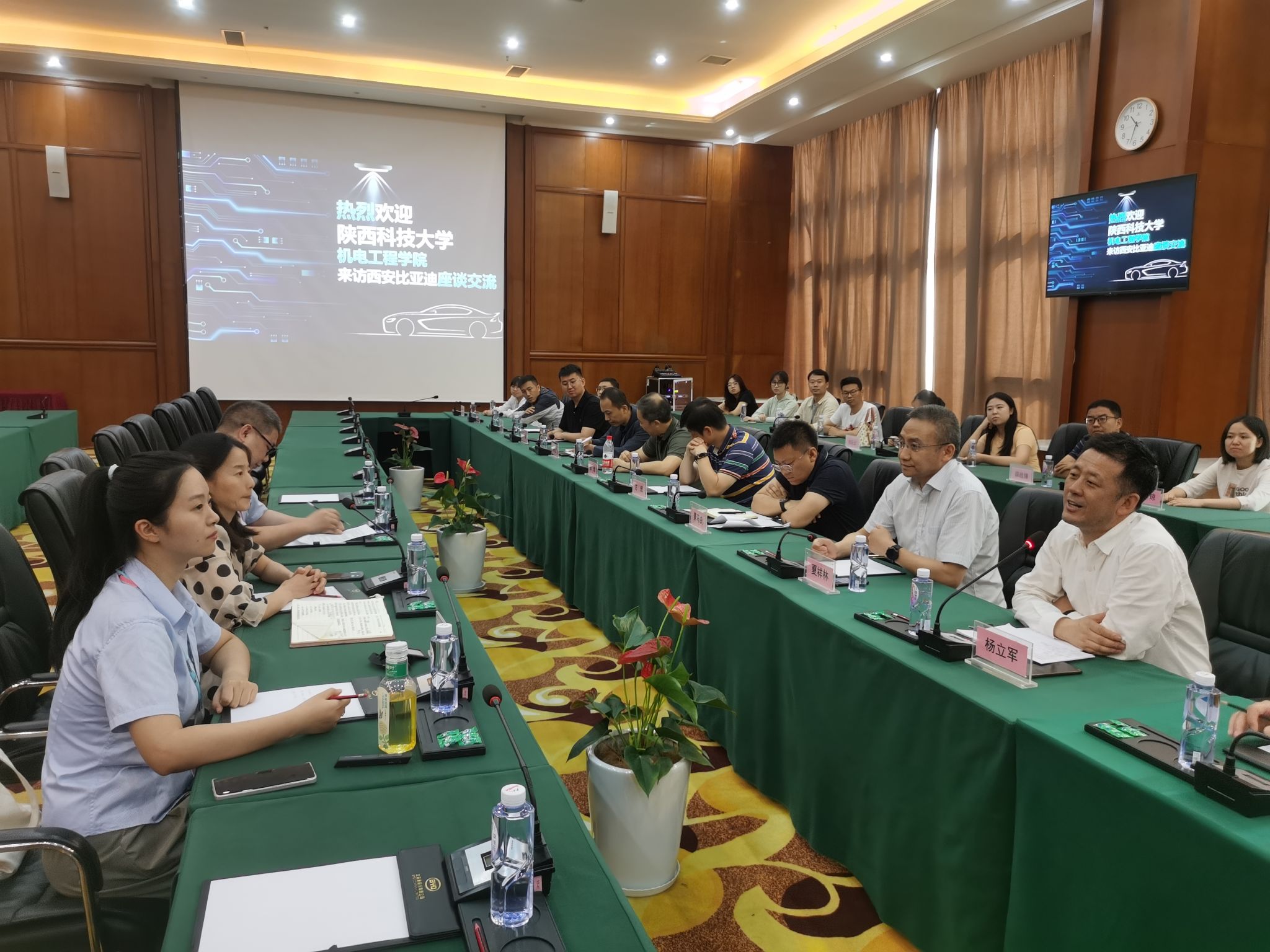 李莉介绍了比亚迪西安基地近年来在产品生产、研发和市场开拓方面所取得的成绩,讲解了公司的用人理念和计划,回顾了陕科大毕业生来公司工作的情况,分享了公司对应届生的培养经验。机电学院学院副院长杨立军讲述了学校和学院的发展情况,机械设计制造及其自动化、材料成型及控制工程、过程装备与控制工程和机器人工程等专业负责人介绍了各专业的办学特色,征求用人单位对专业培养方案修订的意见建议,双方就人才培养看重的因素、就业实习资源对接和项目合作的可行性等进行了深入交流。李培分享了自己毕业后的工作经历和在比亚迪发展取得的成绩。机电学院党委书记夏祥林表示,公司为学院师生提供了深入了解智能制造产线的机会,对办学提出了宝贵的建议,双方探讨了进一步合作的可能性,学院取得了较大的收获。