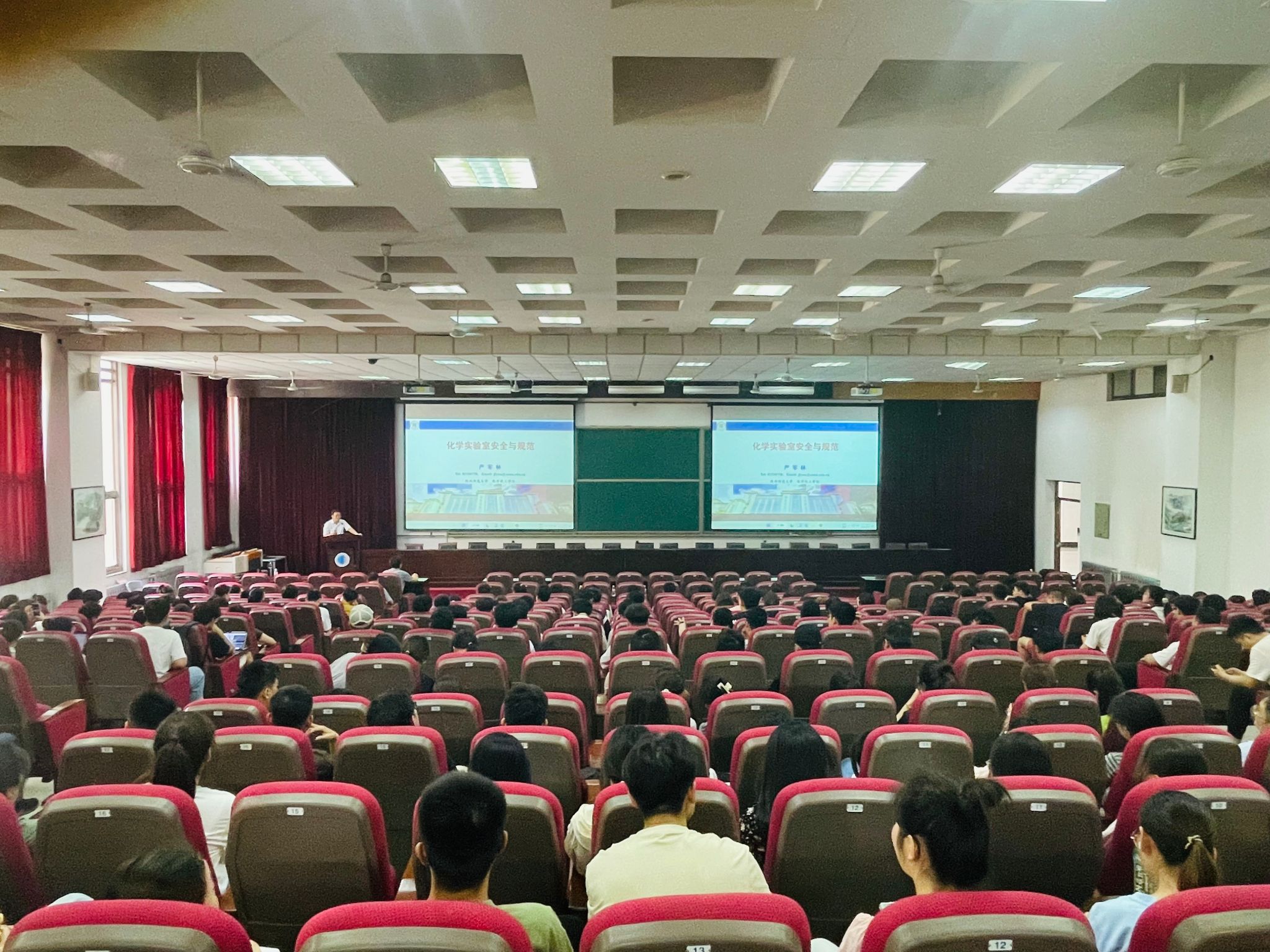 为筑牢校园安全防线,提高师生的实验室安全意识,培养学生对实验室安全事故的处置能力,有效防止实验室安全事故的发生,6月19日下午,化学与化工学院在三号教学楼102会议室开展实验室安全管理及实验安全培训会。培训邀请陕西师范大学应用表面与胶体化学教育部重点实验室副主任、化学国家级实验教学示范中心办公室主任严军林高级实验师讲授。学院全体教师、全体硕、博士研究生和部分本科生参加培训,讲座由化工学院院长助理王伟涛主持,培训会分两阶段进行。