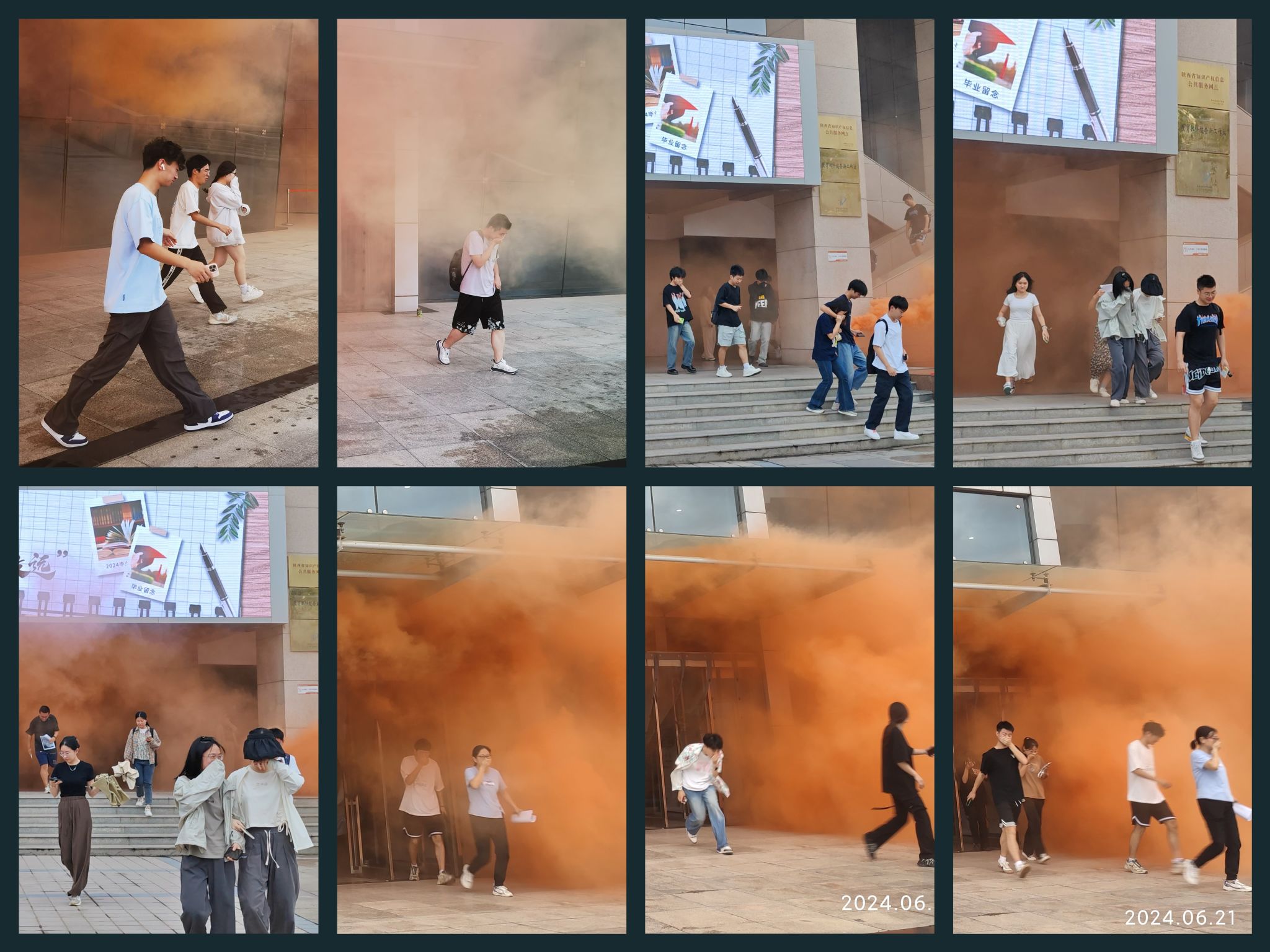 演练当天,工作人员按照演练方案,提前到达负责疏散位置,并通过广播系统播放演练疏散注意事项。9点30分演练正式开始,保卫处设置模拟火源,火警报警系统立即启动,馆内师生在工作人员的指引下,从消防安全通道迅速、有序地撤离到馆外安全区域。