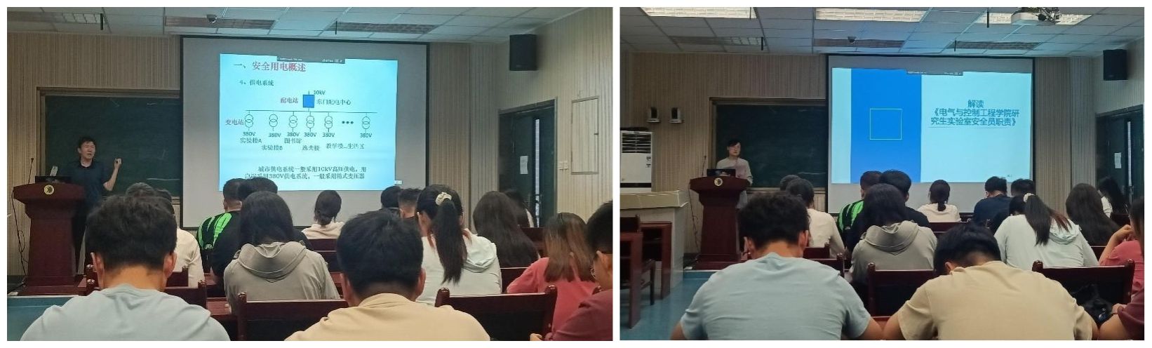 会上,学院分管研究生及实验室工作院长助理杨南强调了设置实验室安全员的重要意义,详细解读了《电气与控制工程学院研究生实验室安全员职责》,同时对全体研究生实验室安全员提出了树牢实验室安全底线思维、极限思维,认真履职尽责的工作要求。学院研究生辅导员任欢对《德赢官网Vwin研究生实验室安全管理细则(试行)》文件精神进行了介绍,明确指出实验室“九不为”,目的是加强实验室安全意识,规范实验室安全管理,保障实验室人员生命和财产安全。学院实验室主任、校实验室安全督导郝鹏飞作了题为《实验室安全用电》的培训,就安全用电知识、触电、安全电压标准、用电安全保护措施、电气火灾及防范措施以及实验室安全注意事项等六部分内容进行详细阐述。培训全面解析了实验室用电安全知识,提升了与会人员的实验室用电知识储备、安全意识以及应急处理能力。