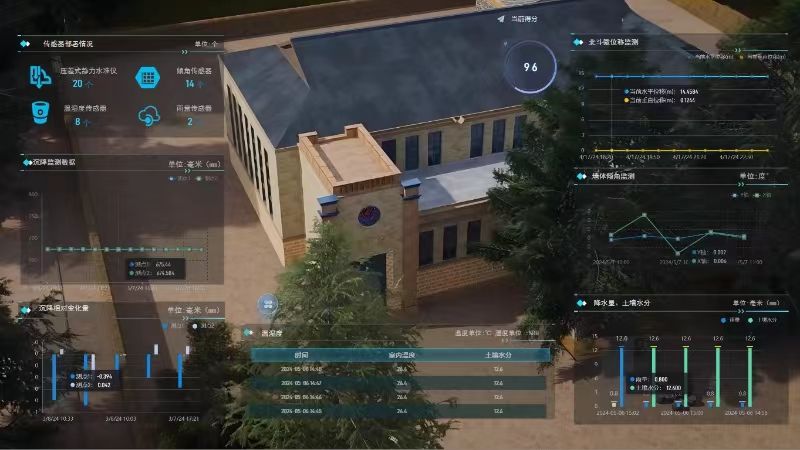 该系统运用先进的数字孪生技术,对杨家岭革命旧址进行三维建模,构建与现实世界一一对应的虚拟空间,利用数字孪生虚实交融、实时交互的特点,结合物联网、北斗技术和数据融合手段,实现了对革命旧址变化的可监测、风险的可预报、险情的可预控。系统通过对建筑物墙体倾斜、建筑沉降、周边山体滑坡、降雨量、温湿度以及土壤水分含量等进行实时监测和数据分析,能够感知物理革命旧址的状态,并进行诊断和预测,及时发现潜在的风险和问题,做到防患于未然。