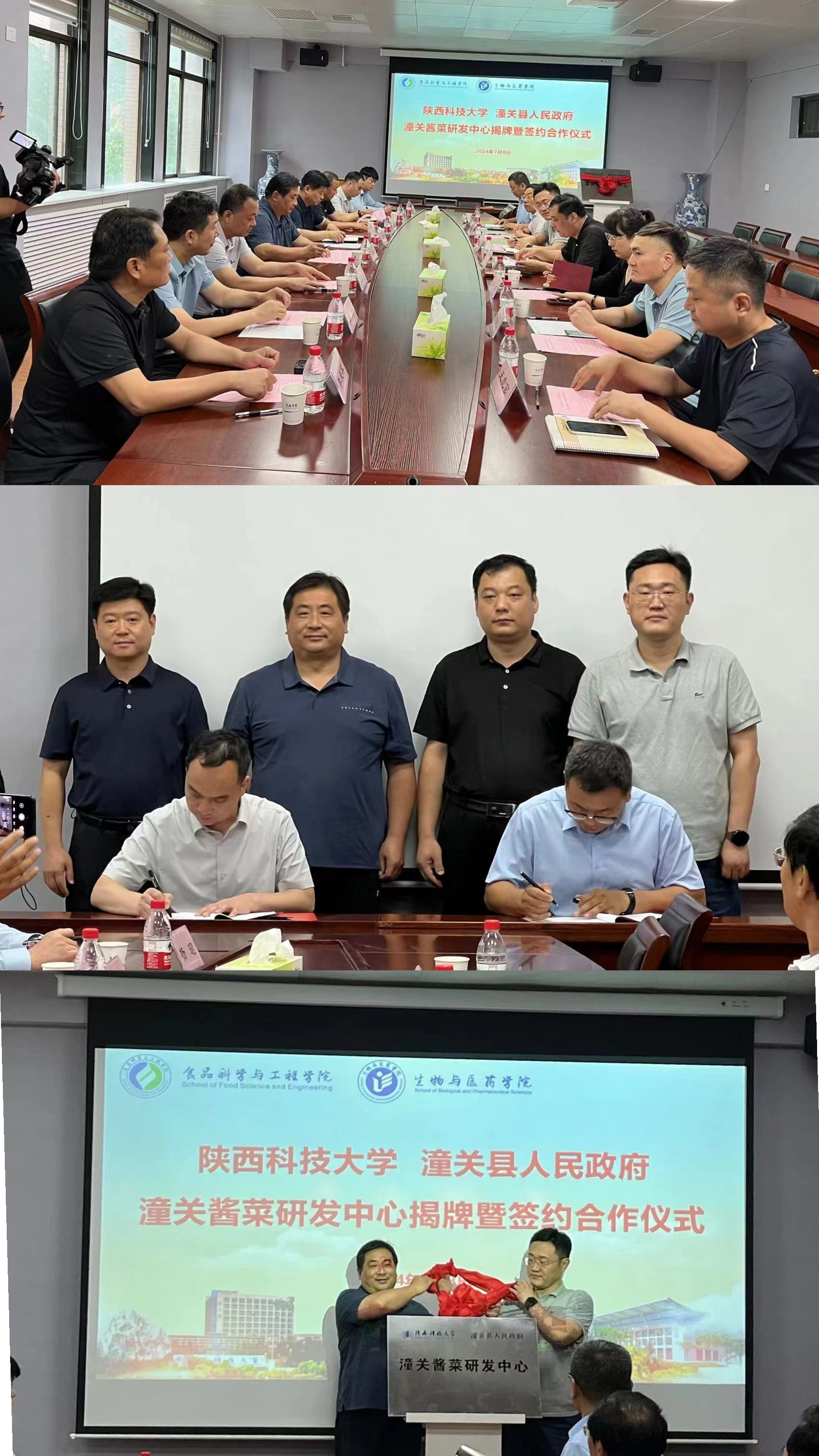 食品学院常大伟副教授作为“潼关酱菜加工生产线建设及产品研发”项目负责人,与潼关县商业发展服务中心主任苏宁超签订了合作协议,李建军与李国梁共同为潼关酱菜研发中心揭牌。