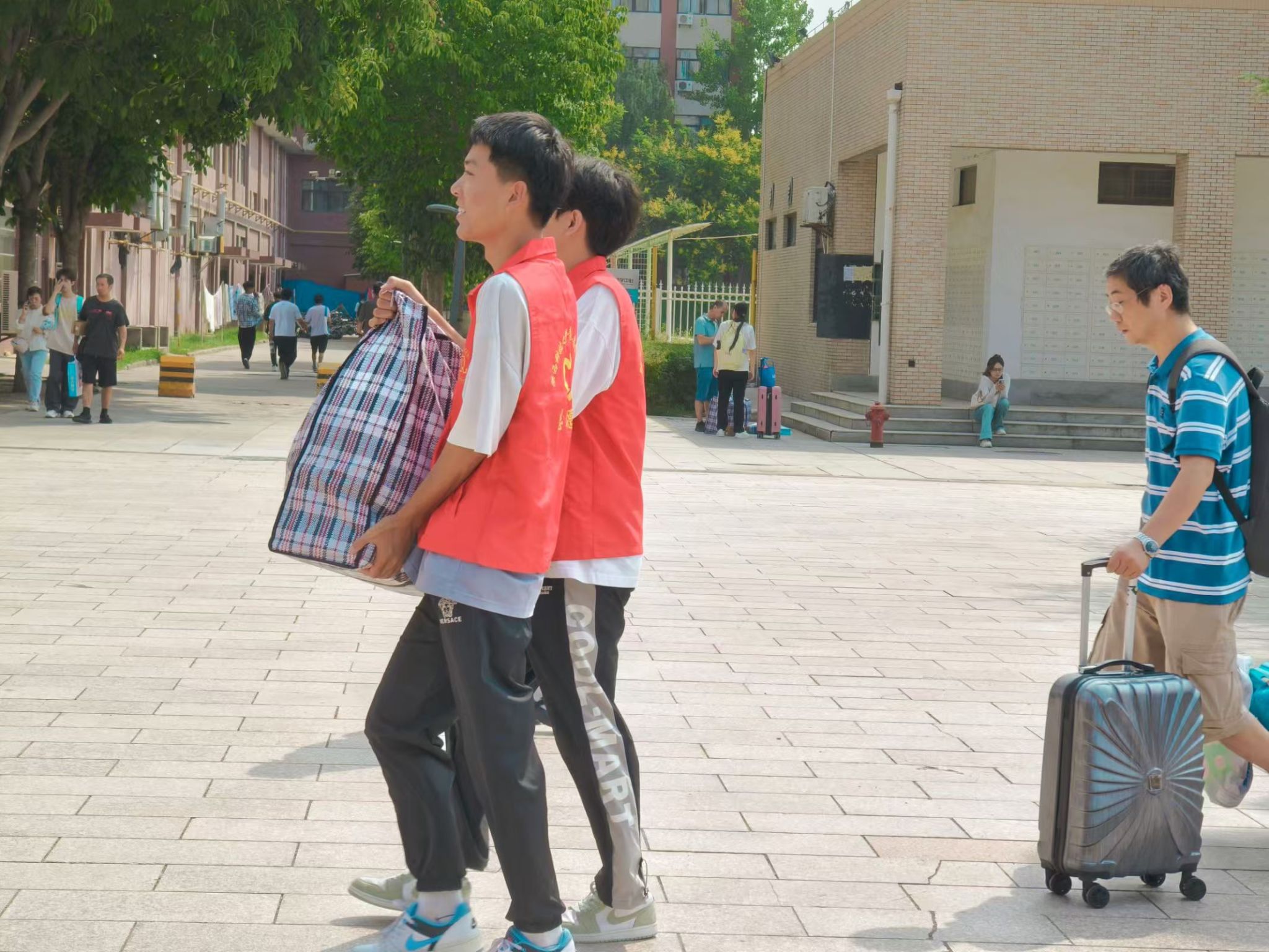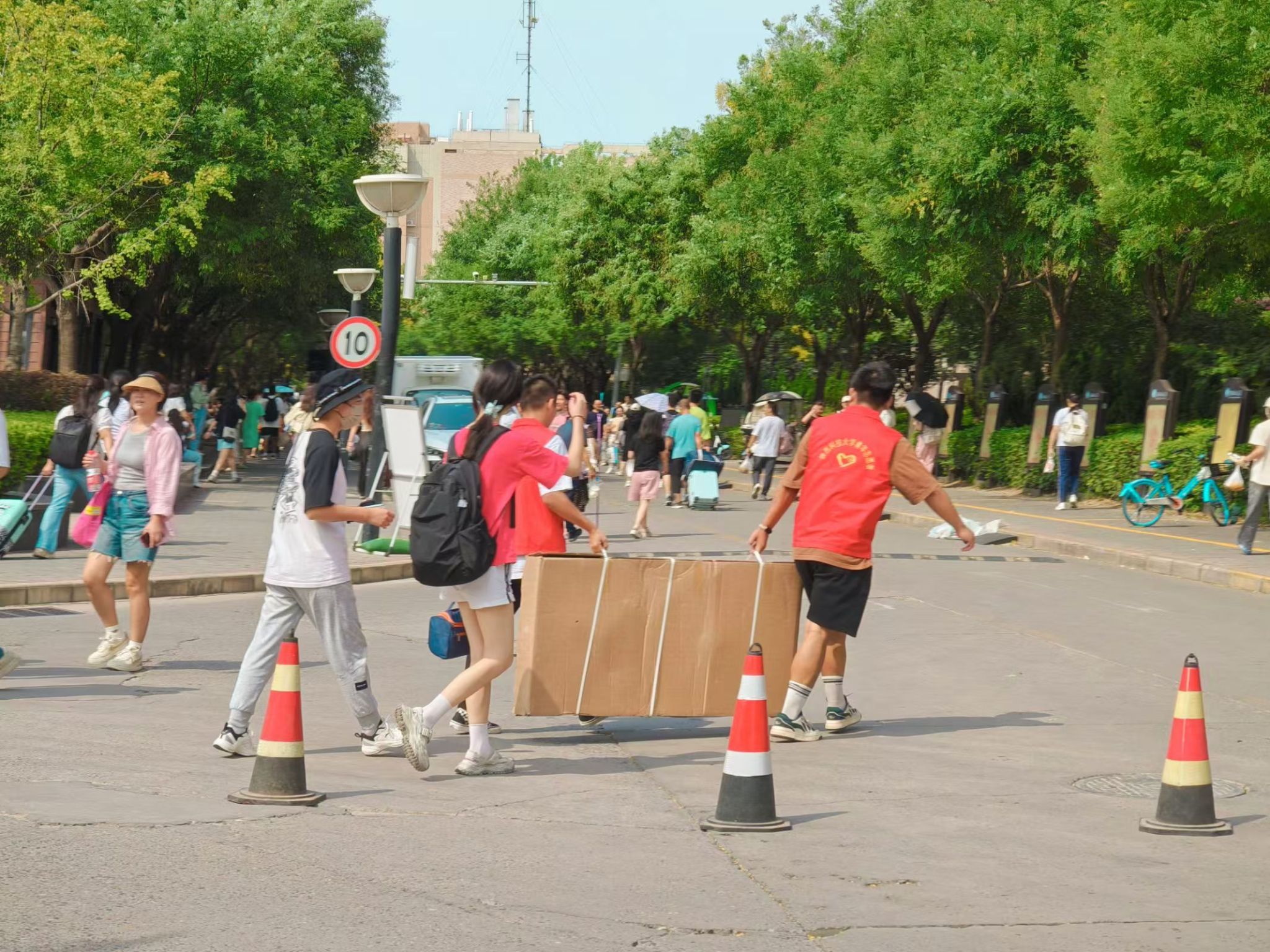 为保证新生安全有序便捷的进入校园,全校共计1400余人次志愿者、准备30多个手推车为新生搬运行李,大家互相配合组成了一支高效的运输队伍。志愿者们在烈日下齐心协力,第一时间向行李繁多的新生伸出援助之手,热情洋溢地将新同学的行李送至公寓楼下,用实际行动为新生入学暖心护航。