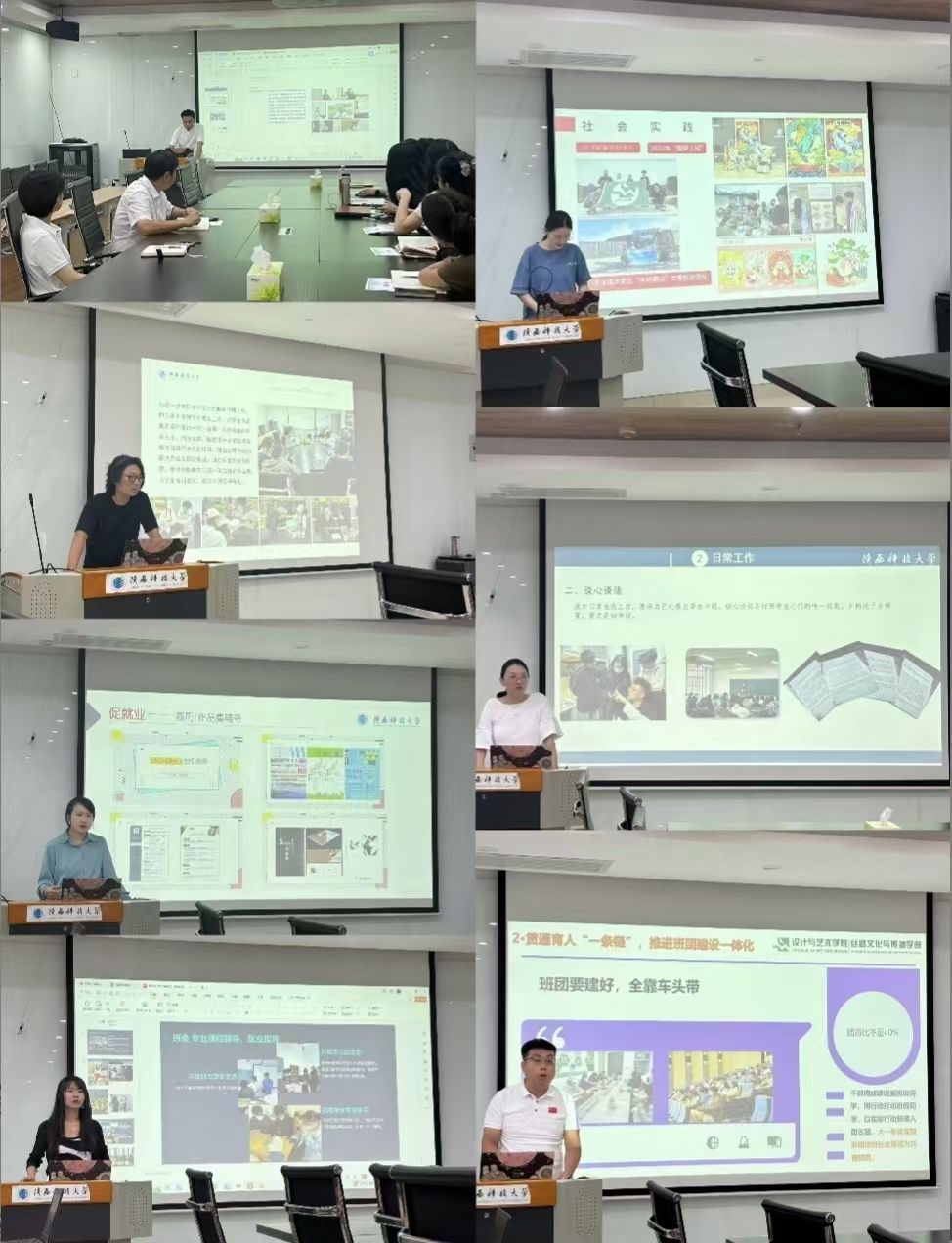 2023年度思政工作先进个人贺译萱、相佳杨两位专职辅导员从大学生思想政治教育的日常事务工作、开展谈心谈话、心理健康教育、资助育人工作、网络思政工作等几个方面,对学生工作进行了整体介绍。学院团委副书记白程铭从班团两委建设、科创竞赛指导、品牌文化活动等方面展示了学院“艺”美育人的工作情况及成效。