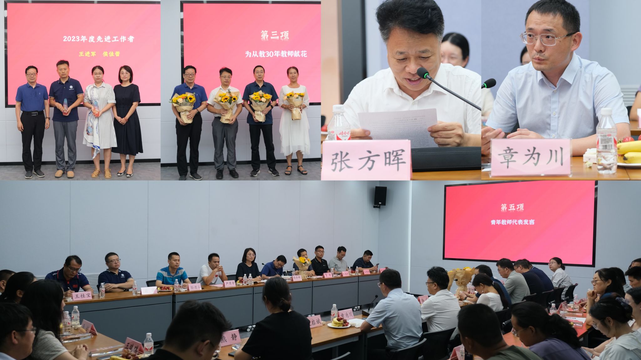 9月9日下午,学院召开庆祝第40个教师节表彰座谈会,学院领导班子、从教30年教师、2023年度优秀教师、青年教师代表参会,会议由院党委书记吕文华主持。会议表彰了2023年度“优秀教师”“思政先进个人”“师德师风先进个人”“先进工作者”等24位教师,青年教师代表向从教30年及以上教师送上了鲜花和祝福。院长马令坤向全体教师致以最诚挚的节日问候,希望老师们始终心怀“国之大者”,强化使命担当,提高合作意识,加强经验交流,进一步促进我院教学研究和学科建设等工作有序开展。吕文华解读了教育家精神的六个维度,对全体教师提出三点期望,一是精神为魂,筑牢信念基石;二是师德为首,彰显行为典范;三是素养提升,紧跟时代步伐,努力为培养德才兼备、有扎实学识的新时代人才赓续奋斗。