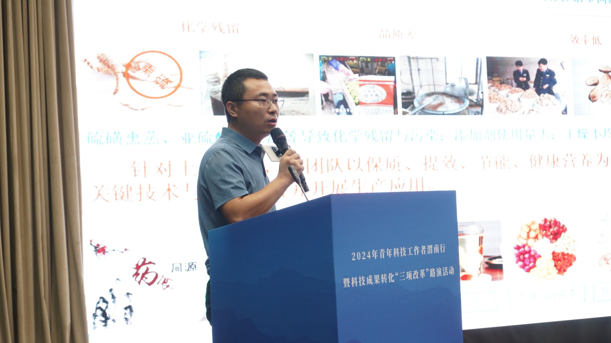 王栋对药食产品绿色智能加工装备的研发与应用进行了项目路演。该项目针对药食产品加工存在的化学处理易残留、品质差、效率低、能耗高等问题,研发出了真空脉动干燥、温湿度控制气流冲击烫漂灭酶护色杀菌、压力脉动控温超声浸提等方面的新型加工技术与系列化智能装备。在中药材(金银花、枸杞、参类、丹皮、茯苓)、药食同源花茶(玫瑰、牡丹)、优质果蔬干制品(枣、葡萄、苹果、桑葚、各类果脯)、速溶养生羹/粥、速溶药食精华、中药浸膏等产品的加工方面效果良好,已在全国几十家单位进行了推广应用。