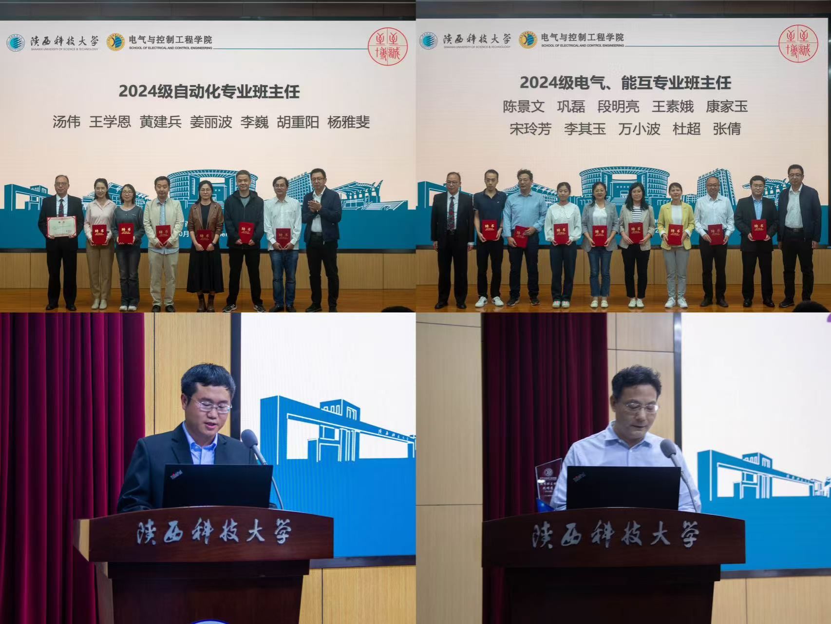 为更好地发挥学院专业教师在学生成长成才中的作用,会议第一阶段表彰2023级新生班主任并聘任2024级新生专业班主任。会上,院党委书记乔明哲、院长汤伟为2023级新生班主任姜苏英、丑幸幸和段明亮颁发“优秀班主任”奖杯,并为2024级新生专业班主任颁发聘书。