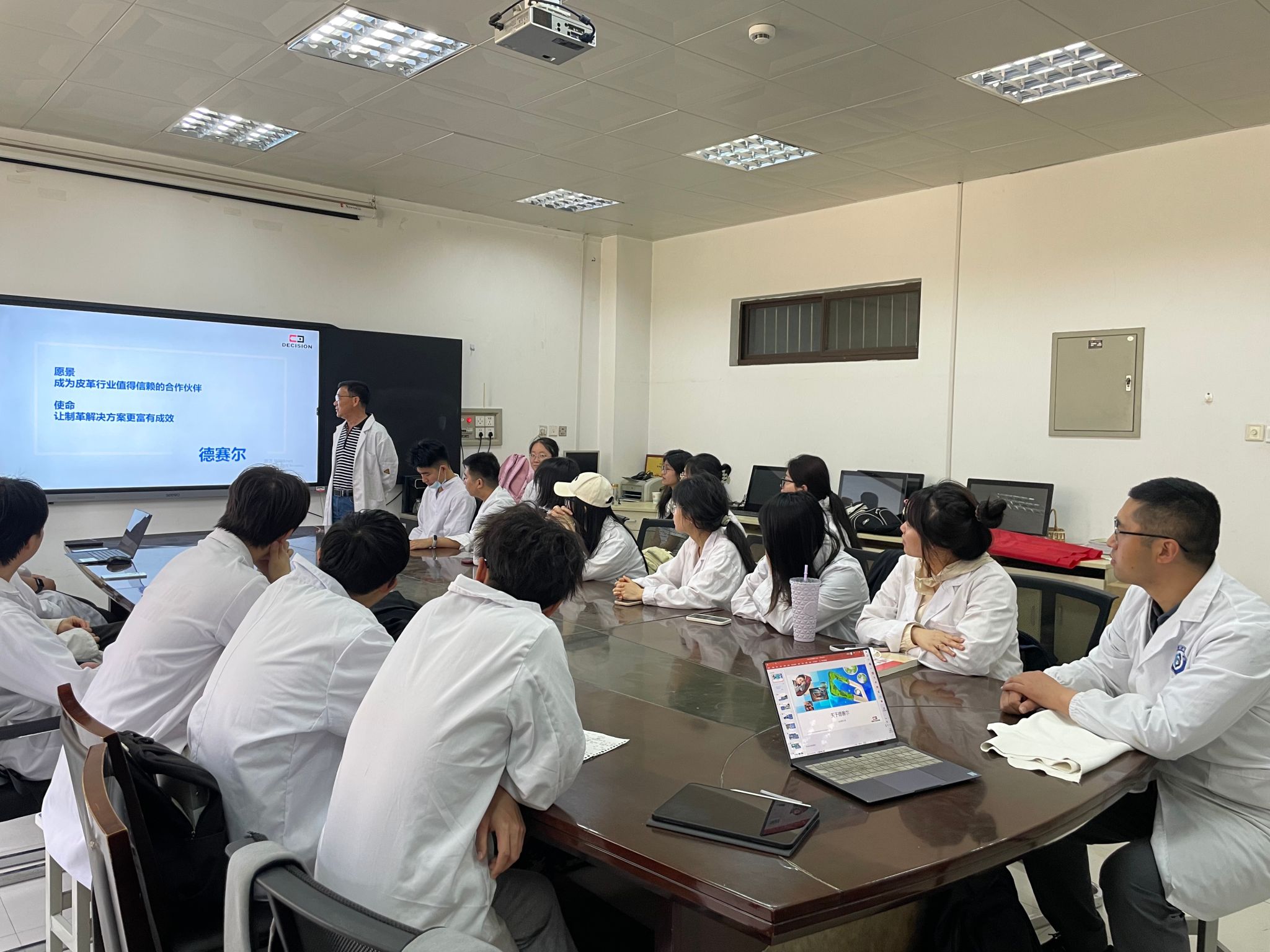 4 月 18-20 日,轻工科学与工程学院皮革系特邀四川德赛尔新材料科技有限公司开展技术交流与演示活动,该公司水场技术主管吴仲蓬经理与校内指导教师一起,指导了轻化工程专业 22 级学生的制革湿整饰实验,并进行了无铬鞣技术交流与演示活动。此次活动让学院师生深入了解了制革的前沿技术,同时也 拓展了专业视野。 在专题讲座环节,吴仲蓬经理以《德赛尔DWT/CFW无铬鞣体系》为题, 介绍了四川德赛尔新材料科技有限公司的基本概况和该公司 DWT/CFW 无铬鞣体系的技术特点。通过丰富、详实的讲解,让师生们全面了解了目前市场主流无铬鞣技术的特点、应用领域和发展趋势。