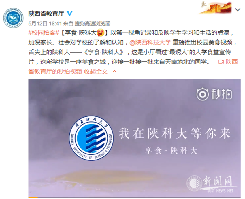 5月12日,陕西省教育厅官方微博报道德赢官网本科招生系列微视频“我在陕科大等你来”的第一部分之《享食·陕科大》。
