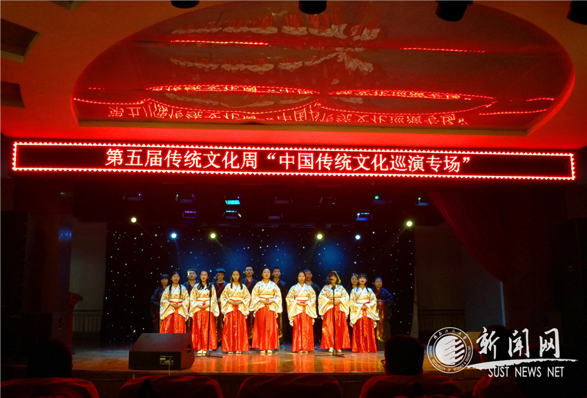 活动第二阶段,社团管理中心在大学生活动中心举办传统文化巡演专场。当晚,国学社带来的合唱《桃夭》,西安越剧团和易俗社带来的越剧表演《南腔北调唱大戏》,长安大学乐群相声社带来的相声表演《大上寿》,武术协会带来的武术表演《止戈》,国学社带来的《茶道展示》等节目得到了现场同学们的好评。