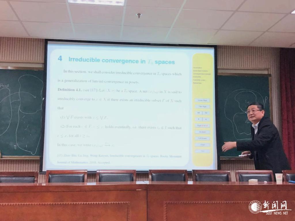 赵彬教授长期从事格上拓扑学与非经典数理逻辑的研究。报告会上,赵教授从实直线上的拓扑结构与代数结构谈起,通过不断提升引入到本次报告的主题T0拓扑空间中的两类收敛,进而给出T0空间中不可约收敛和序收敛性的具体刻画。会后,赵教授还与文理学院师生就如何将拓扑的方法引入到其它学科中做出了深入交流探讨。