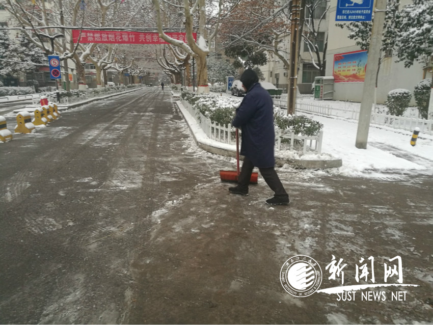 此次管委会共有20余人参加扫雪铲冰工作。截止上午9点,咸阳校区管委会的部分职工仍奋战在扫雪第一线……