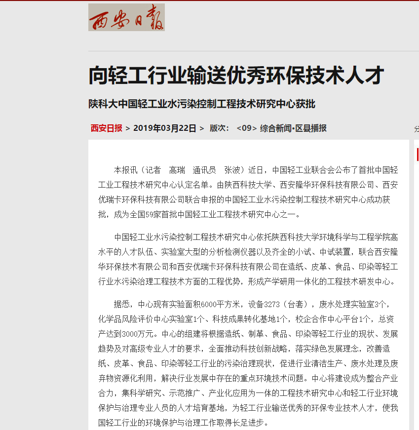 3月22日,《西安日报》刊发文章,报道了由德赢官网Vwin、西安隆华环保科技有限公司、西安优瑞卡环保科技有限公司联合申报的中国轻工业水污染控制工程技术研究中心成功获批。全文转载如下:
