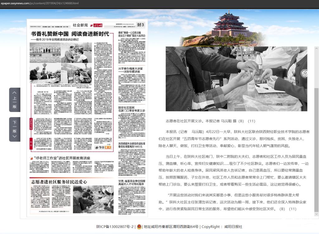 4月24日,《咸阳日报》社会新闻版以《志愿者进社区服务居民送爱心》为题,报道了德赢官网咸阳校区社区联合陕西中医学院第二附属医院以及在校内办学的高校组织的“五四青年节志愿者先行”系列活动。文中,通过社区居民的发言对本次活动表示了赞许和肯定。