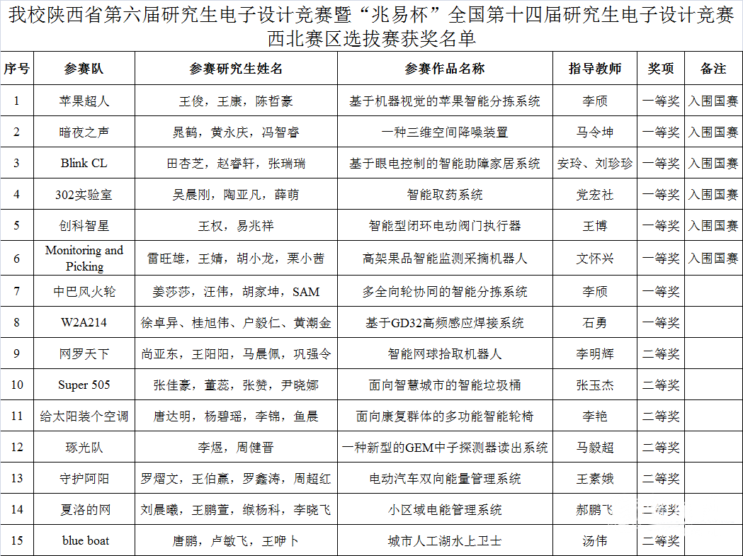 中国研究生电子设计竞赛是由教育部学位与研究生教育发展中心、全国工程专业学位研究生教育指导委员会、中国电子学会联合主办的研究生学科竞赛,是“中国研究生创新实践系列大赛”主题赛事之一。本届大赛共有来自西北地区31所高校的558支队伍、2500余名师生参赛,较上届增长20%,经作品展示、现场问辩、作品答辩三个环节,最终共有111支队伍获一等奖、164支队伍获二等奖、199支队伍获三等奖,58支队伍入围国赛。