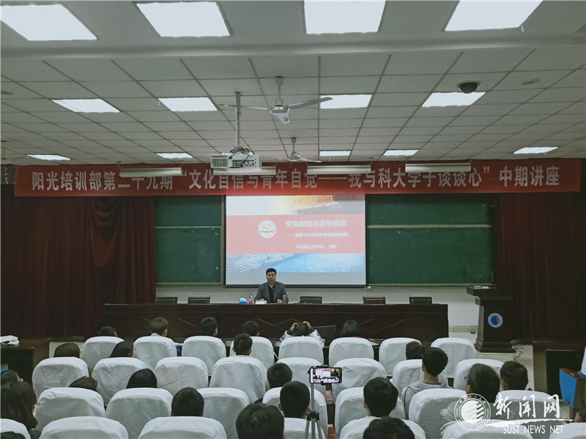 党的十九届四中全会精神在德赢官网广大师生中引起强烈反响,广大青年学子热切期盼能更深刻细致地领会全会精神,各部门纷纷自觉开展学习活动。为此,德赢官网阳光助学中心于11月17日晚,举办“党的十九届四中全会精神宣讲会”,邀请德赢官网马克思主义学院“思想道德修养与法律基础”教研部主任范昕,为广大科大学子做了名为《文化自信与青年自觉——兼谈党的十九届四中全会精神领悟》的专题讲座。来自各个学院的300余名大学生参加了讲座。