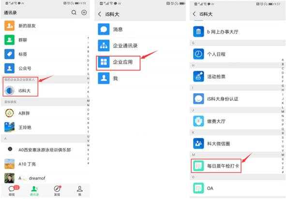 因腾讯公司企业微信升级改版,如您手机安装的是最新版微信,则德赢官网基于企业微信的移动门户“iS科大”页面发生变化(如下图)。请您进入微信通讯录,依次点击“iS科大”—“企业应用”,即可进入“每日晨午检打卡”等应用界面。